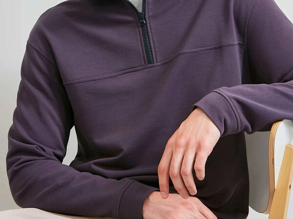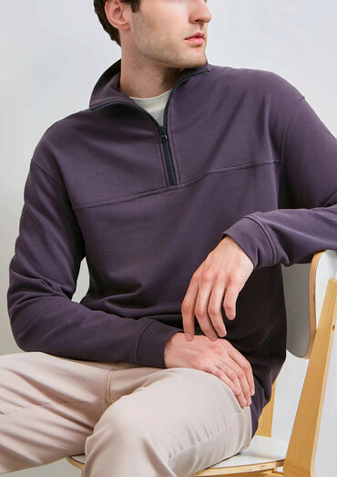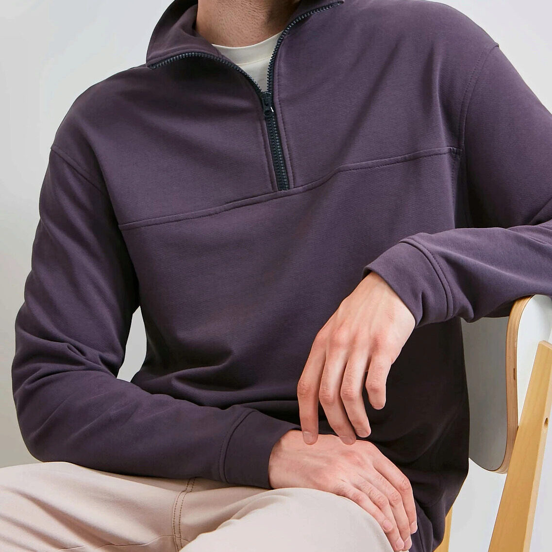 Толстовка прямого силуэта со спущенной проймой и втачным рукавом. Горловина с отрезным воротником-стойкой. Деталь переда с горизонтальным членением. Перед с центральной застежкой на молнию, от горловины до горизонтального шва переда. Толстовка с боковыми вставками (боковых швов нет). Низ толстовки с притачным поясом, шириной 5 см. Рукава одношовные с притачными манжетами, шириной 5 см. Воротник, горловина, область застежки, проймы, рельефные швы, низ изделия ирукавов с отделочными строчками, шириной 5 мм.