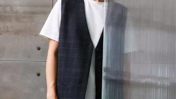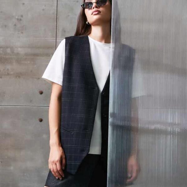 Жилет прямого силуэта с открытой застежкой на 4 прорезные петли и 4 пуговицы. Перед с прорезными карманами в рамку и фигурной линией низа. Отрезной бочок с перепадом длин между бочком и передом/спинкой. Спинка со средним швом, заканчивающийся шлицей. Жилет на подкладке. Жилет сшит из костюмной