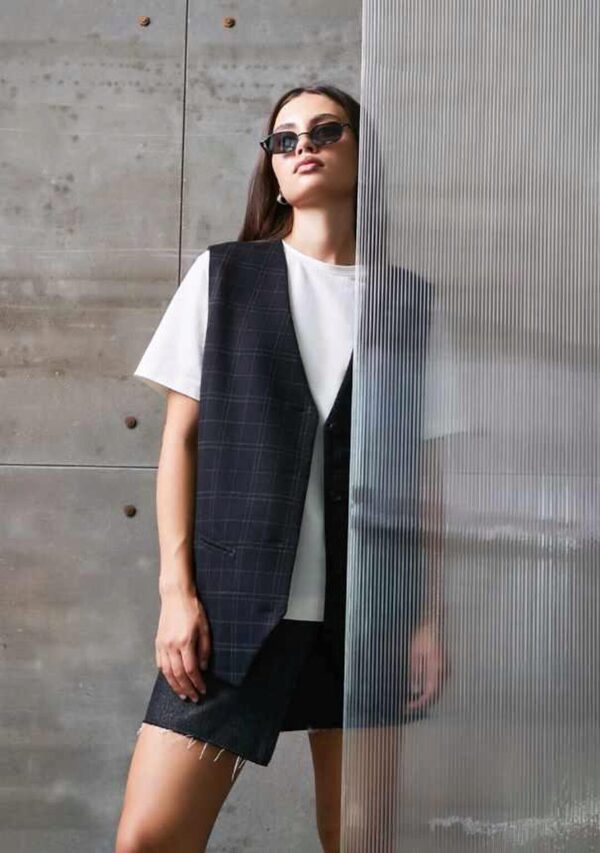 Жилет прилегающего силуэта с открытой застежкой на 3 прорезные петли и 3 пуговицы. Перед с талиевыми вытачками и фигурной линией низа. Спинка со средним швом и талиевыми вытачками. Жилет на подкладке. Жилет сшит из костюмной ткани вискоза стрейч, состав полиэстер 60%, вискоза 35%, спандекс 5%,
