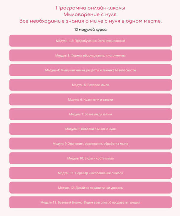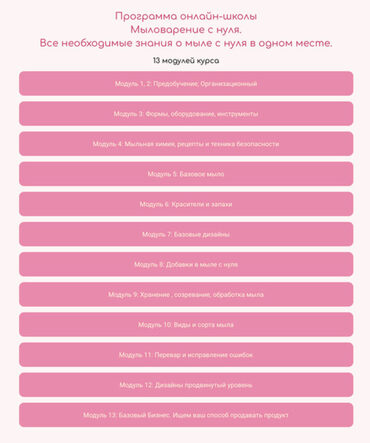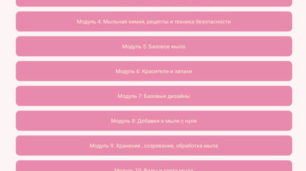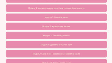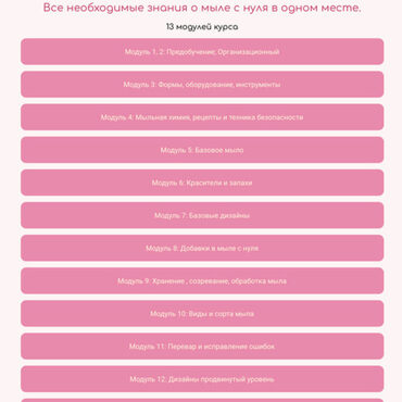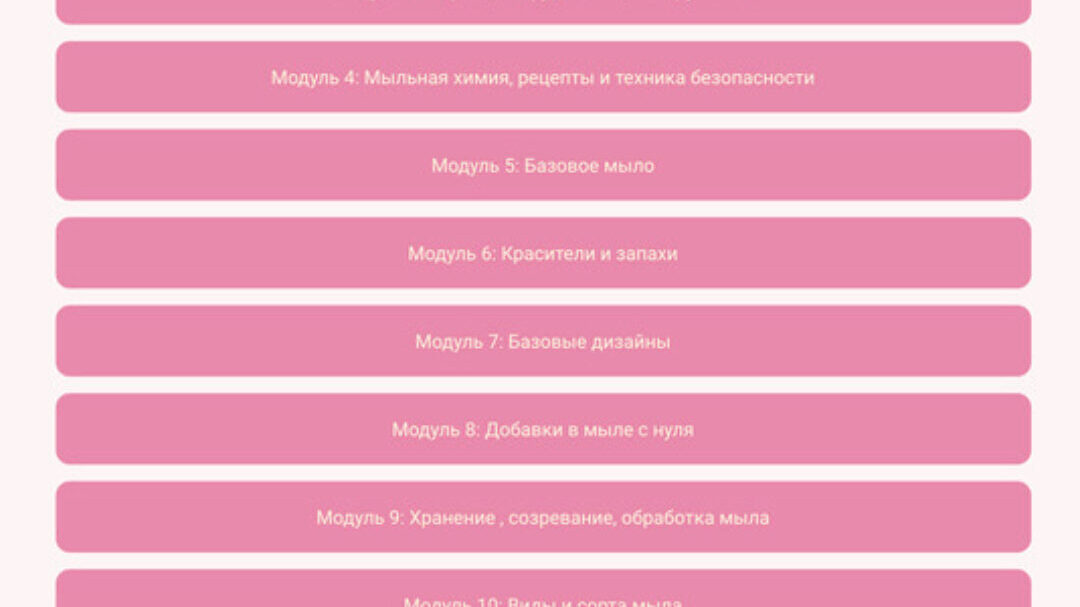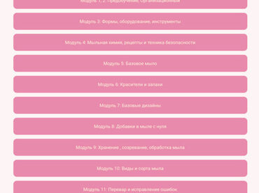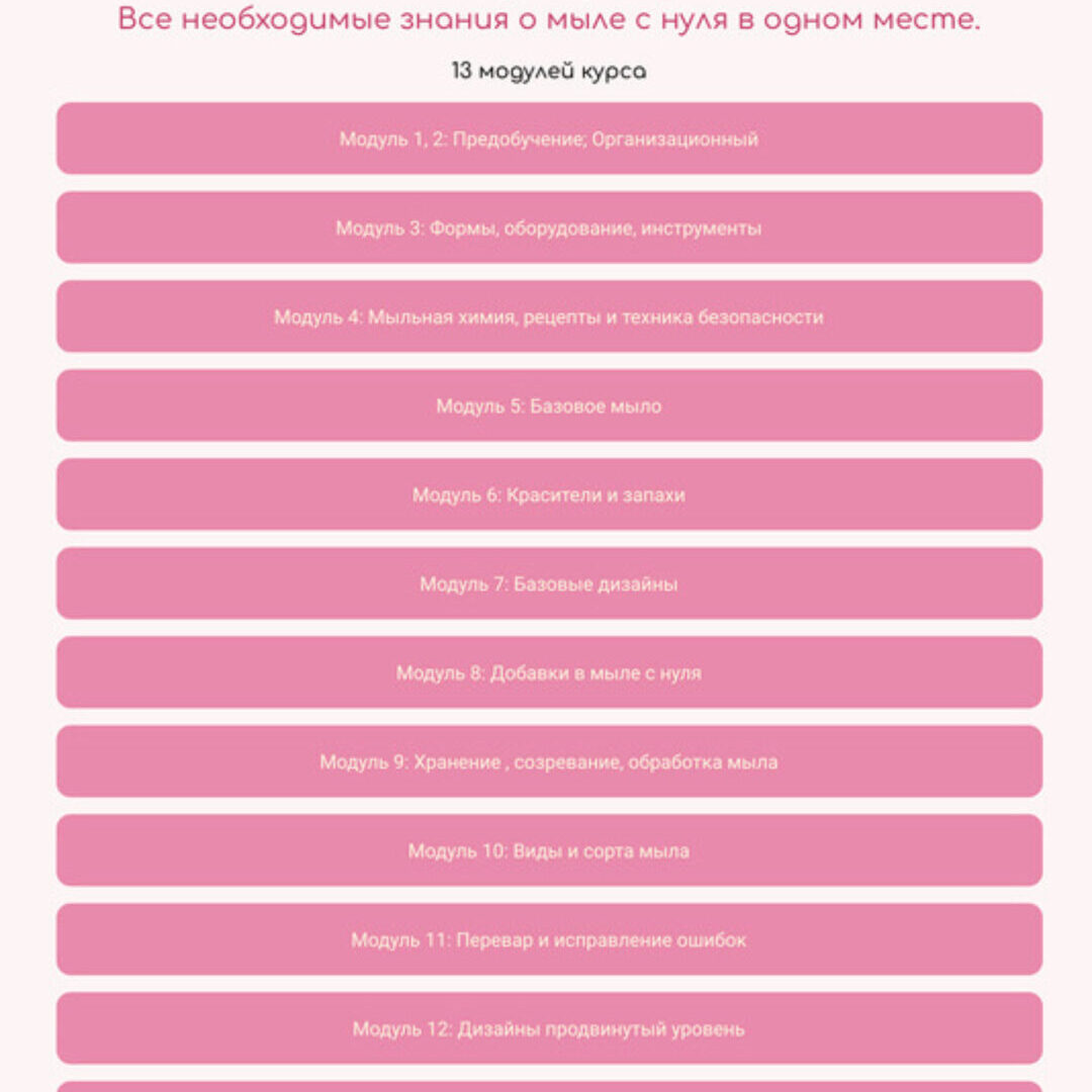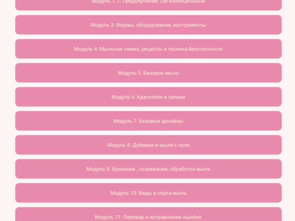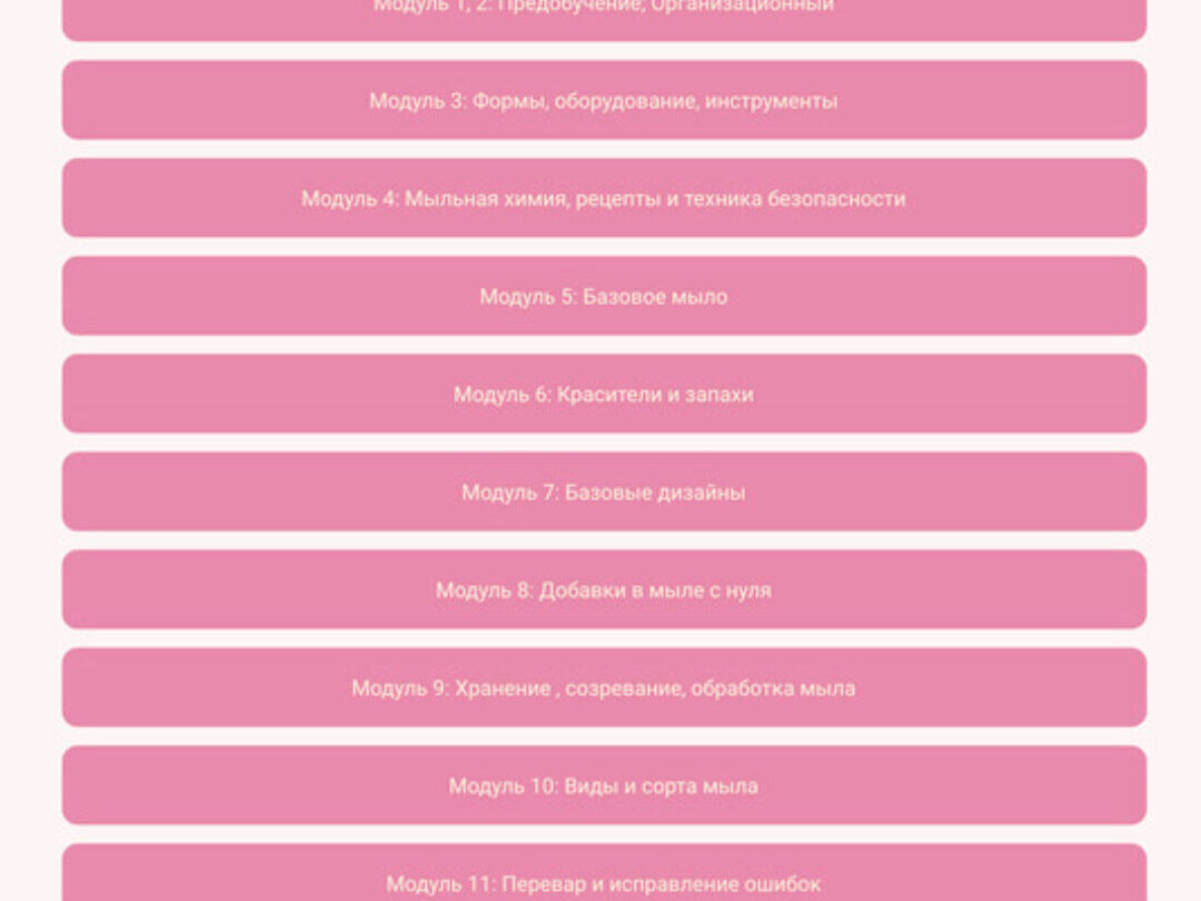 Мастер 13 Модулей предобучение Организационный Формы, оборудование, инструменты Мыльная химия, рецепты и техника безопасности Базовое мыло Красители и запахи Базовые дизайны Добавки в мыле с нуля Хранение созревание, обработка мыла Бизнес на мыле с нуля, западный опыт. Виды и сорта мыла Перевар и