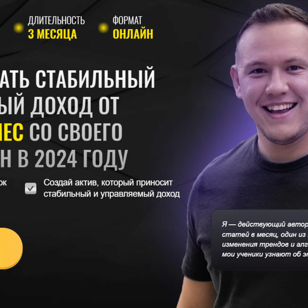 На курсе вы: Выберите нишу в инфобизнесе, разберетесь с вашими страхами и ограничениями Создадите и упакуете Телеграм-канал Разработаете первый продукт Запустите простейшую автоворонку в Телеграм Научитесь привлекать подписчиков бесплатно Подключите систему приема оплат 8 уроков в HD качестве