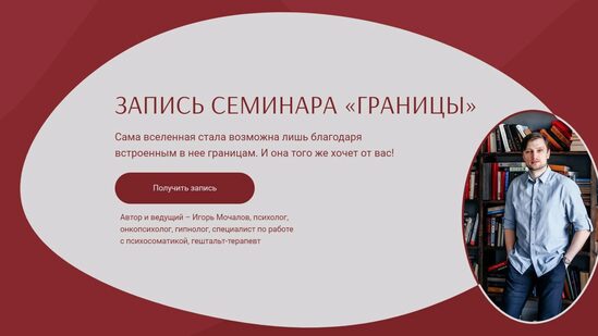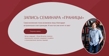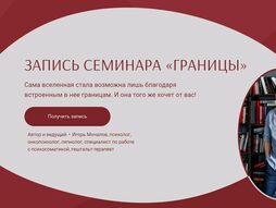 Внутри вас должен совершиться некий эмоциональный процесс — признание внутри себя этой правды и этого права. Данный семинар даст ход этому процессу и ответит на самые важные и наболевшие вопросы о границах.