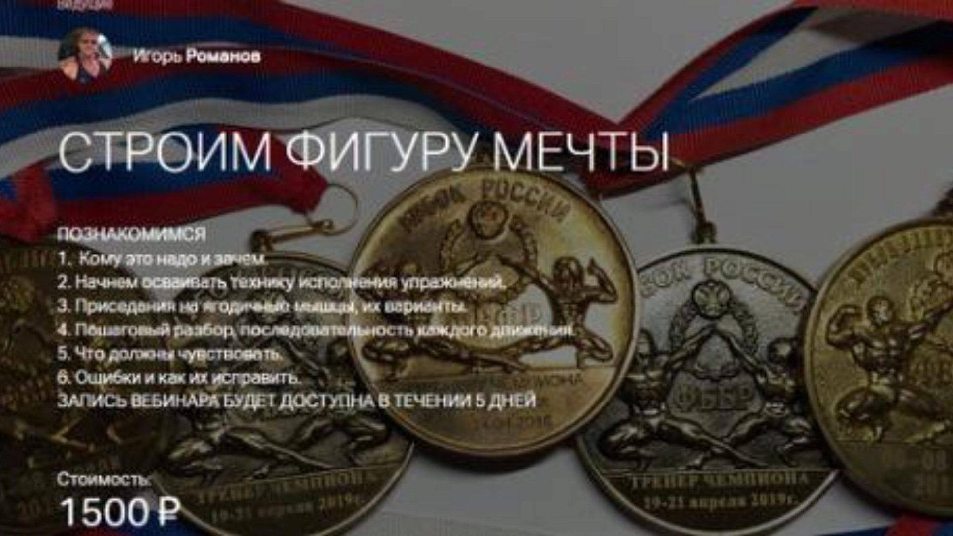 СТРОИМ ФИГУРУ МЕЧТЫ 12 ПРОГРАММА ТРЕНИРОВОК. ЧЕТВЕРТЫЙ ТРЕНИРОВОЧНЫЙ КОМПЛЕКС от тренера чемпионок Игоря Романова Во избежании плато и лучшего прогресса, меняем тренировочный комплекс Продолжаем постигать тайны тренировочного процесса с Игорем Романовым Стоимость: 2000 ₽ Начало: 20 дек. 2019