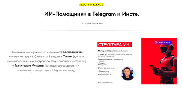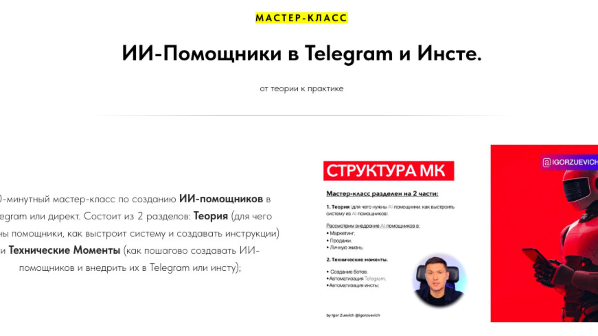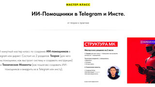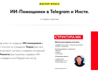 - Пошаговый Мастер-Класс процесс создания ИИ-помощников в Telegram и инсту для внедрения в Воронки Продаж, Умные Лид-магниты, Личную жизнь и т.п.;
