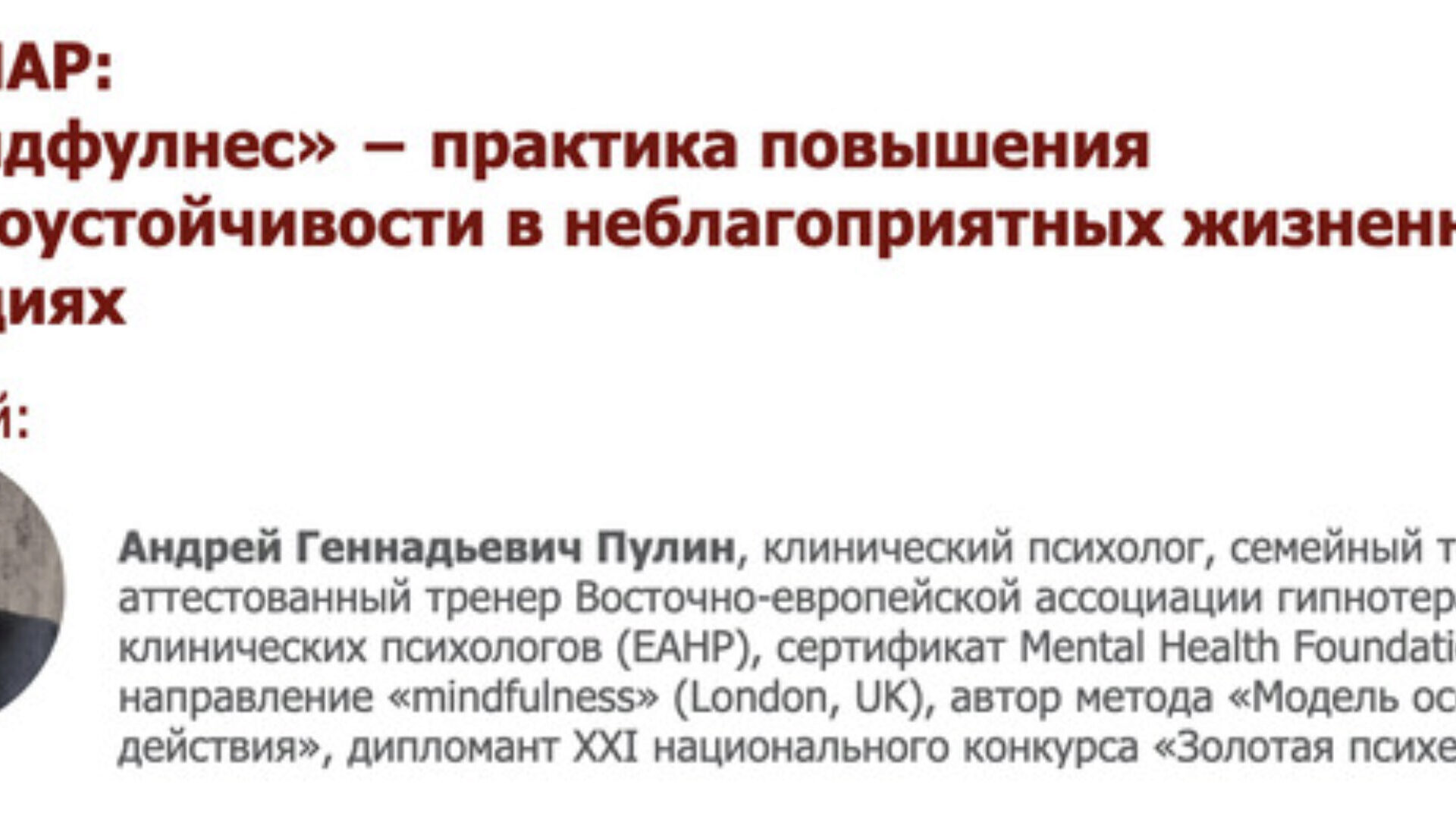 Даты проведения 11.05.2020 - 15.05.2020 Практика «Mindfulness» – золотой стандарт когнитивно-поведенческой психотерапии, эффективность которого подтверждена научными исследованиями (в результате занятий «майндфулнес» фиксируются позитивные изменения структуры головного мозга на снимках МРТ). По
