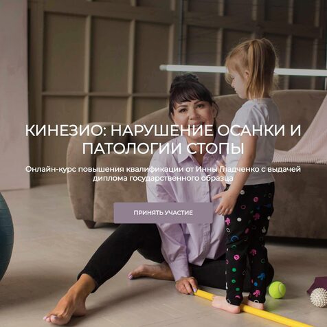 Онлайн-курс повышения квалификации от Инны Гладченко с выдачей диплома государственного образца. О чем этот курс? Я дам вам понимание, что существует великое множество разнообразных сочетаний недоразвитий и патологии формирования стоп и осанки. Вы получите при каждой из них работающий инструмент в