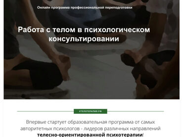 Программа повышения квалификации от лидеров различных направлений телесно-ориентированной терапии. Продолжительность обучения — 8 месяцев Срок освоения — 250 часов Основная задача программы - дать слушателям целостное и системное представление о возможностях работы с телом в психологическом