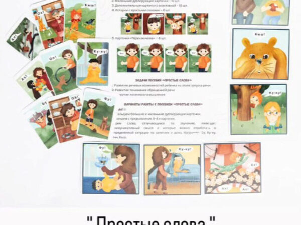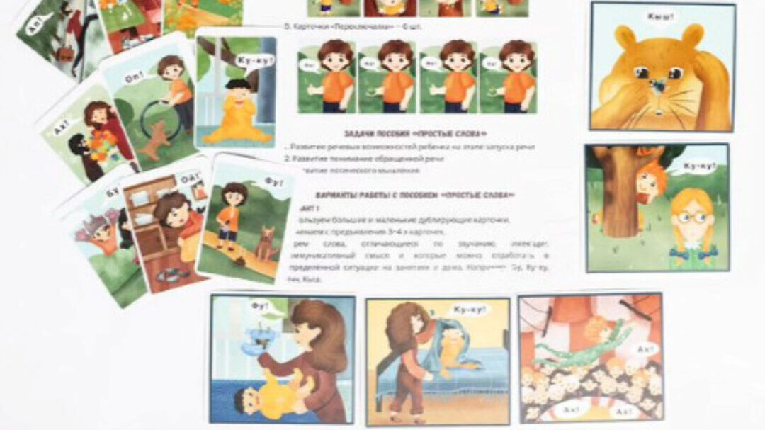 Пособие включает: - 20 карточек - действий - 20 карточек - нелепиц - 20 карточек - действий в прошедшем времени - 20 пиктограмм - 20 картинок предметов (отвечающие на вопрос «ЧЕМ» ) - 20 картинок предметов (отвеч. на вопрос «ЧТО») - 4 плашки для ассоциативного ряда - 12 картинок (отвечает на «КТО»)