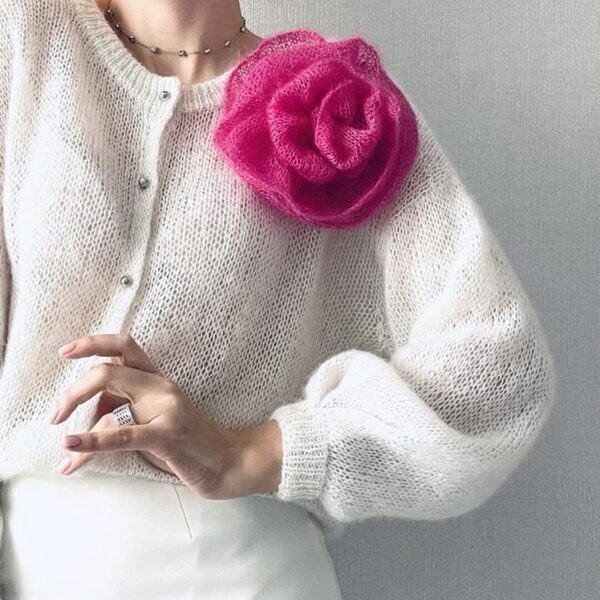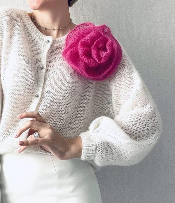 Кардиган прямого фасона, свободного силуэта, круглый вырез оформленный двойной обвязкой горловины. Исполнение рукава возможно в 3 вариантах: пышный, зауженный и с декоративными складками. Кардиган вяжется снизу вверх. Рукав набирается из проймы.