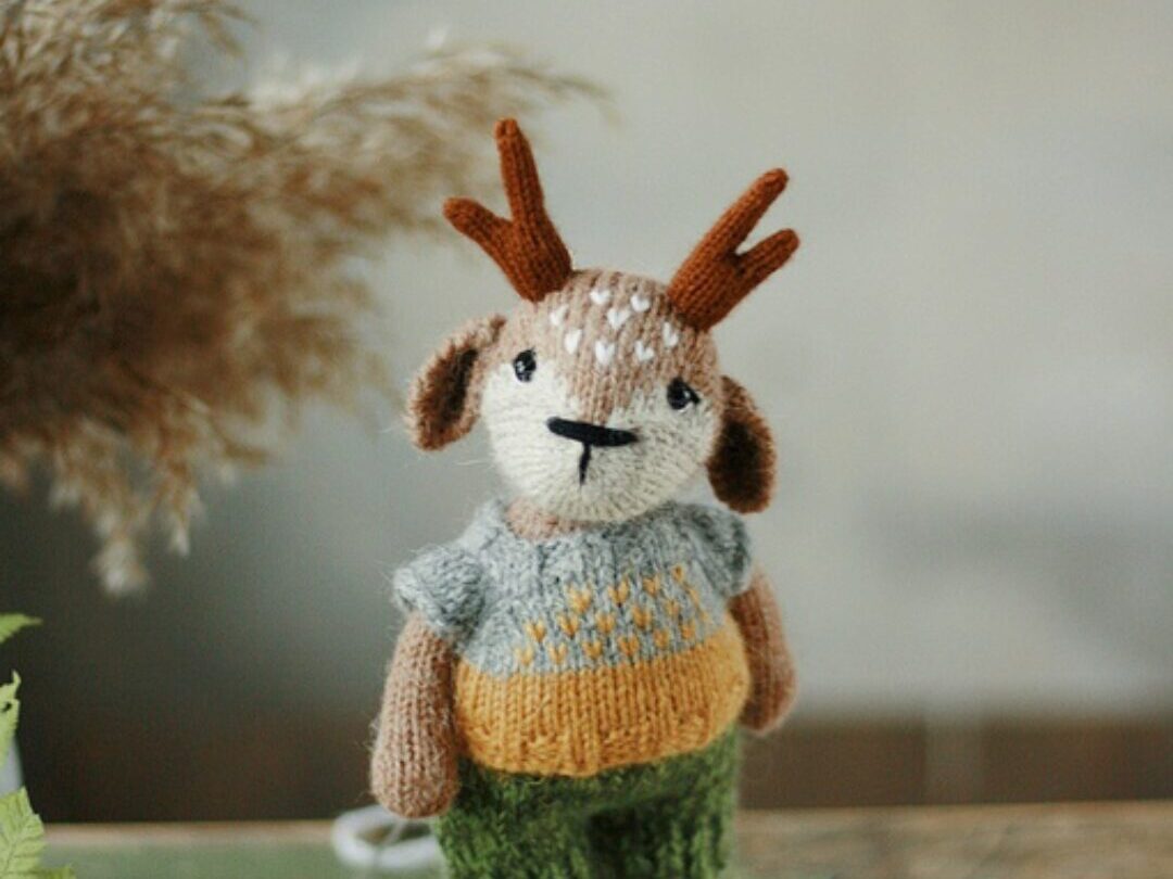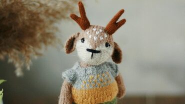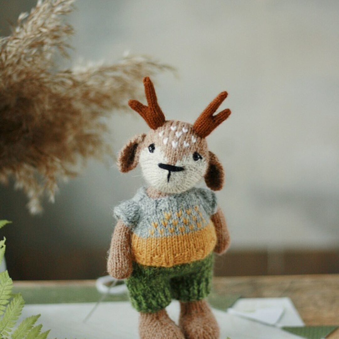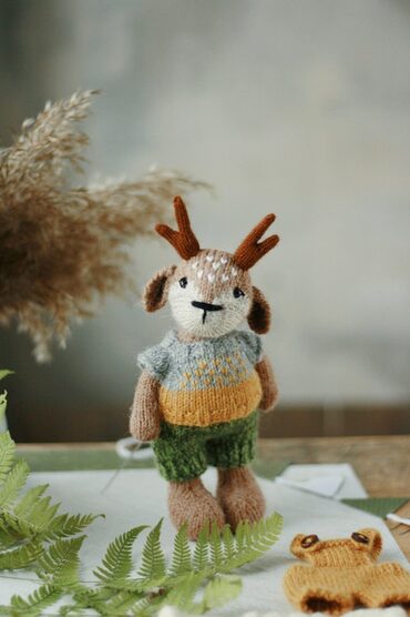 В формате PDF. 23 стр, 65 фотографии процесса. Все детали вяжутся на трёх спицах, четвёртая рабочая. Уши крючком. Голова и лапки пришиваются. Готовая игрушка получается 14 см. Есть короткие ряды в технике « Оберни и поверни » . Содержит описание свитера. Основная пряжа Alize Alpaca Royal. Спицы 1,8