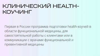 Это комплексная экспертная программа подготовки health-коучей-консультантов в области функциональной медицины Программа даст вам необходимые знания и инструменты для работы с людьми с различными заболеваниями: как физическими, так и психическими. Работа с такими клиентами требует углубленной и