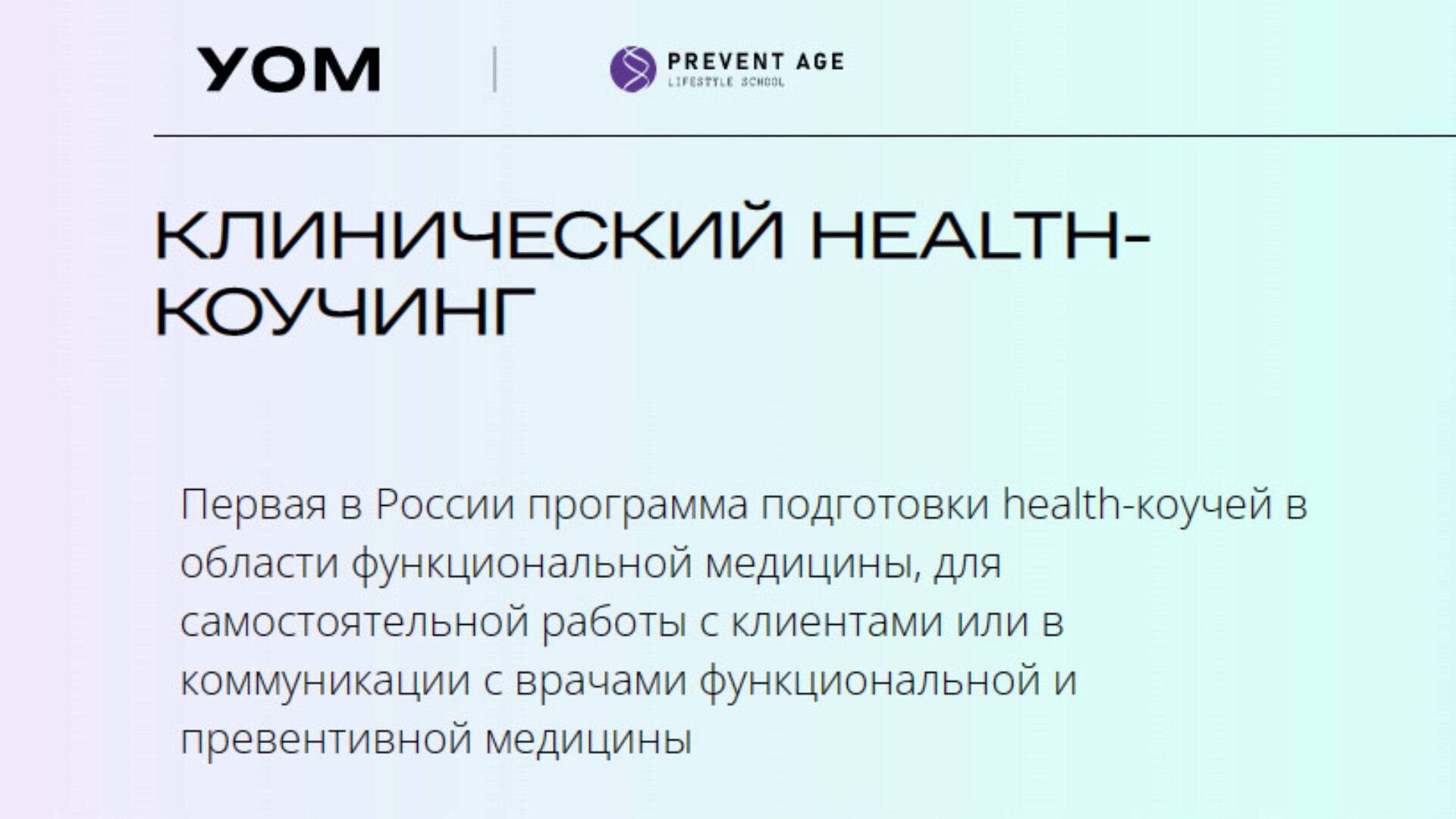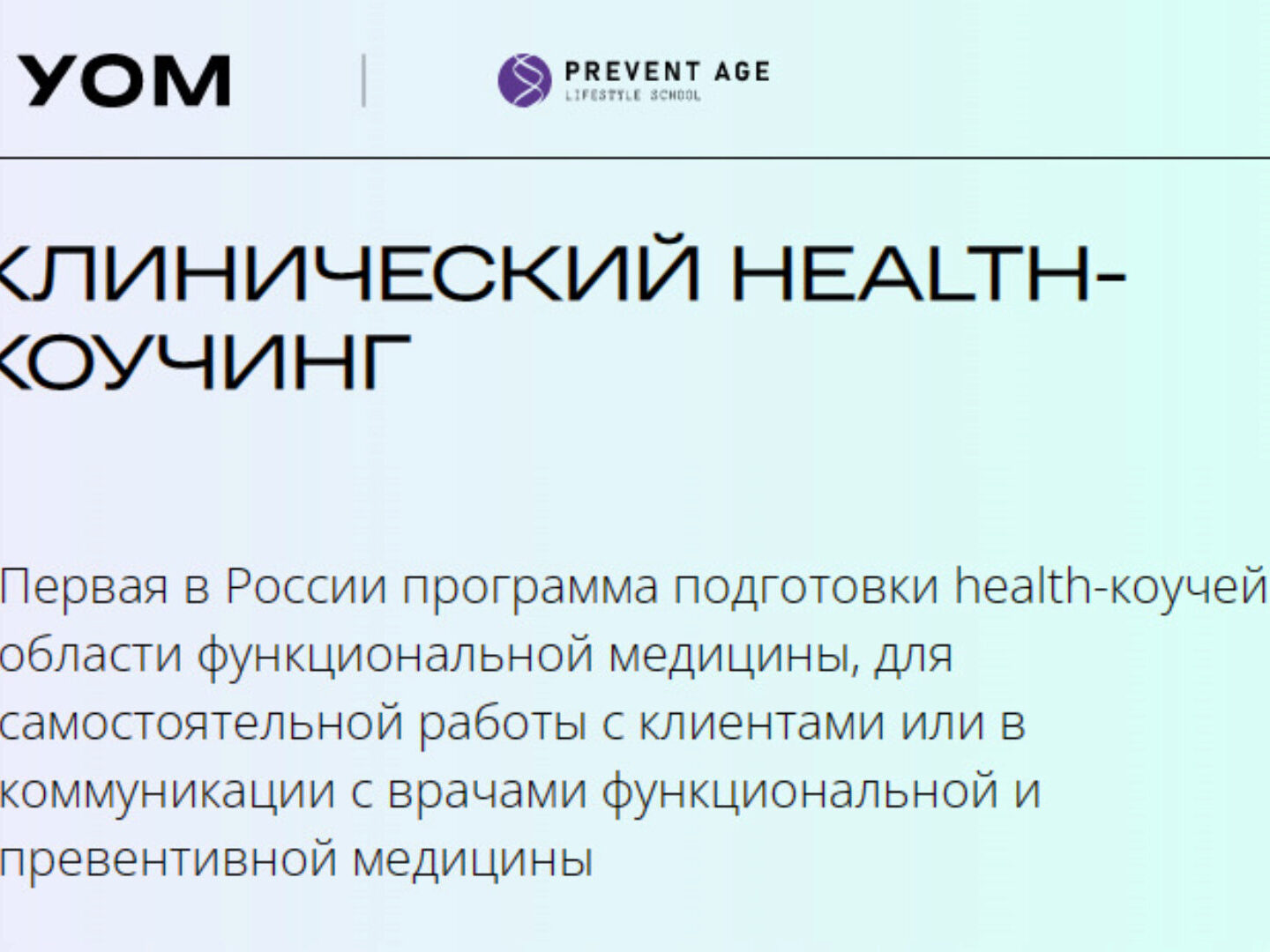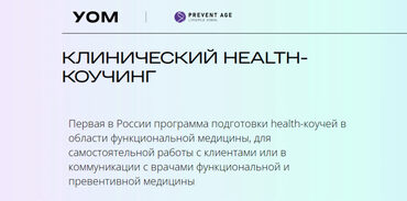 Клинический health-коучинг УОМ | PreventAge Первая в России программа подготовки health-коучей в области функциональной медицины, для самостоятельной работы с клиентами или в коммуникации с врачами функциональной и превентивной медицины Это комплексная экспертная программа подготовки