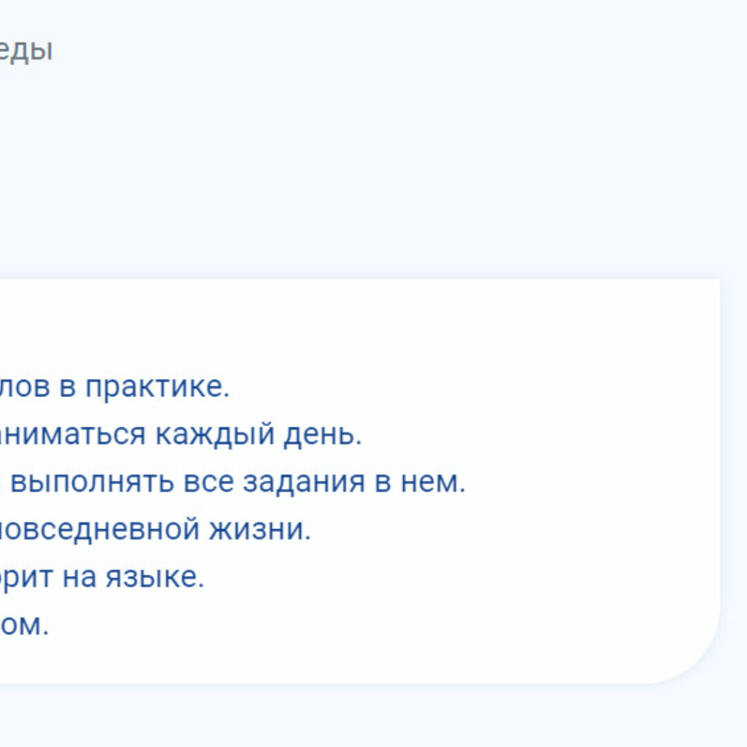 Пройдя этот курс, вам больше не придется пытаться что-то читать с бумажек при попытках заговорить, — все разговорное будет у вас на слуху и в голове, от зубов отскакивать.