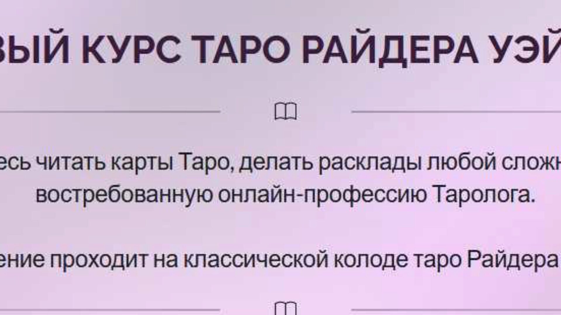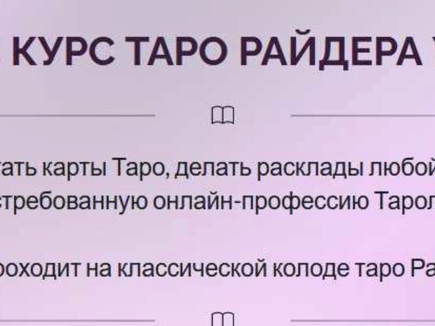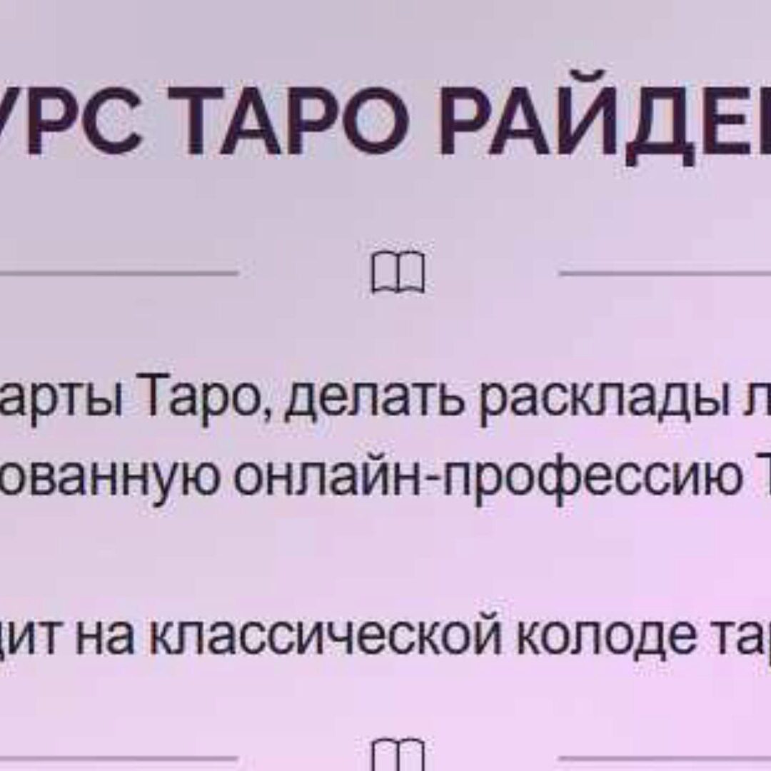 Для тех кто хочет перейти на новый уровень в раскладах Таро О курсе - простая и проверенная система обучения - получите уникальные знания по трактовкам которых нет в интернете - научитесь четко считывать информацию не путаясь в трактовках - обретете новую востребованную профессию - сможете