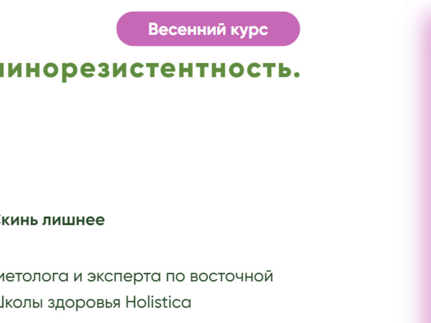 Кому подходит этот курс? Поклонники ЗОЖ Познакомитесь со своим организмом и из десятков методов и систем выберете ту, что подходит именно вам Мамы Узнаете, как поддерживать здоровье ребенка питанием и справляться с его капризами режимом и простыми процедурами Худеющие Избавитесь от лишнего веса без