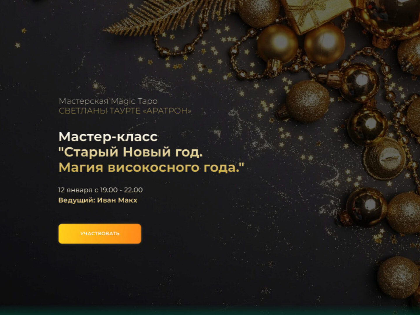 [Aratron] Вебинар Старый Новый год Магия самого названия уже манит: одновременно Старый и Новый год... А знаете ли вы, что это последняя возможность нашаманить себе счастья на 2023 год? Теперь знаете! Это действительно волшебная ночь, когда можно исправить все, что не нравится, что угрожает,