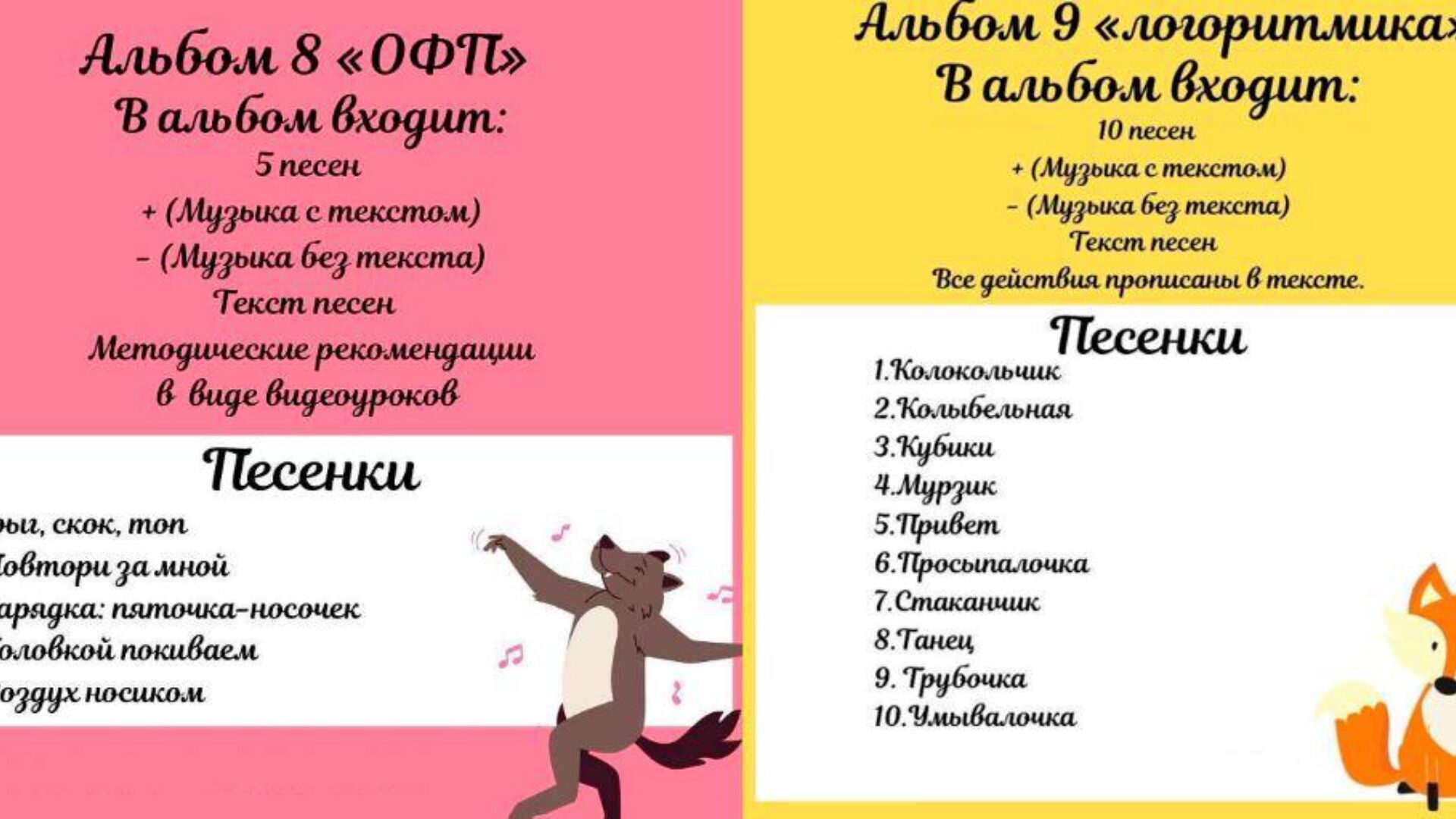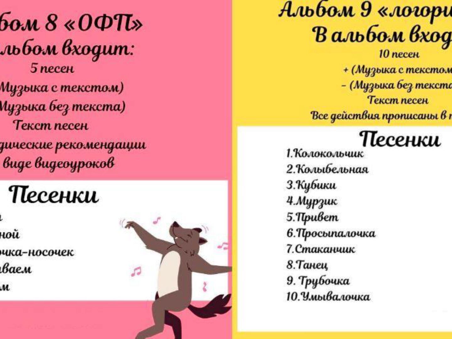 Альбом №4. В альбоме 12 песенок, плюсы и минусы входят в альбом! Альбом развивает: ️соматогнозис (схема тела); ️чувство ритма; ️саморегуляцию; ️переключение; ️удержание моторной программы; ️слуховое восприятие; ️межполушарные связи; ️улучшает психо-эмоциональное состояние .. Для кого: для деток с