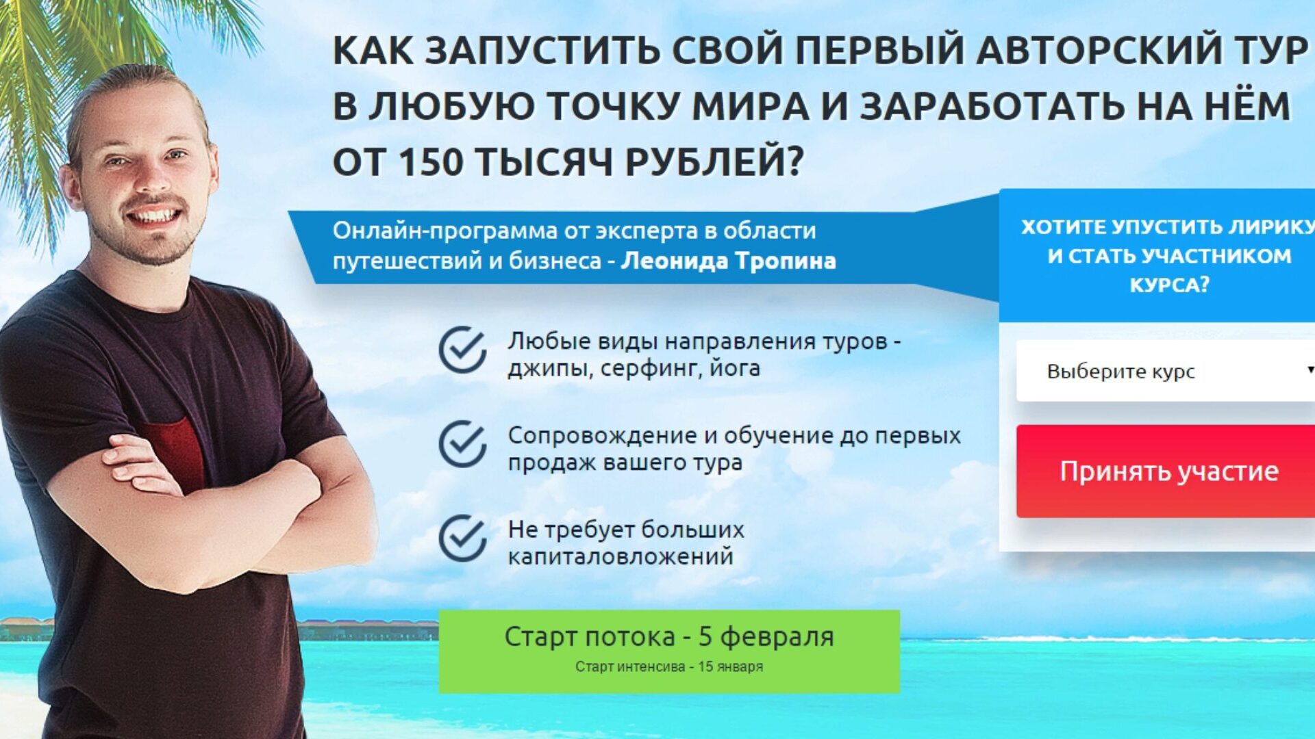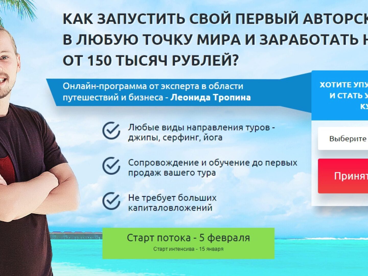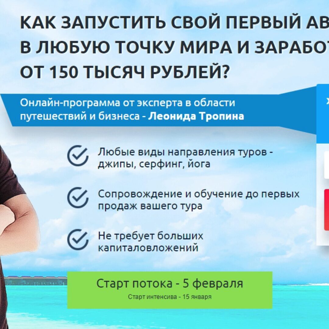 ЗА 1,5 МЕСЯЦА ОБУЧЕНИЯ ВЫ СОЗДАДИТЕ ПРОГРАММУ СВОЕГО ТУРА, ЗАПУСТИТЕ РЕКЛАМУ, ПОЛУЧИТЕПЕРВЫЕ ПРЕДОПЛАТЫ И: