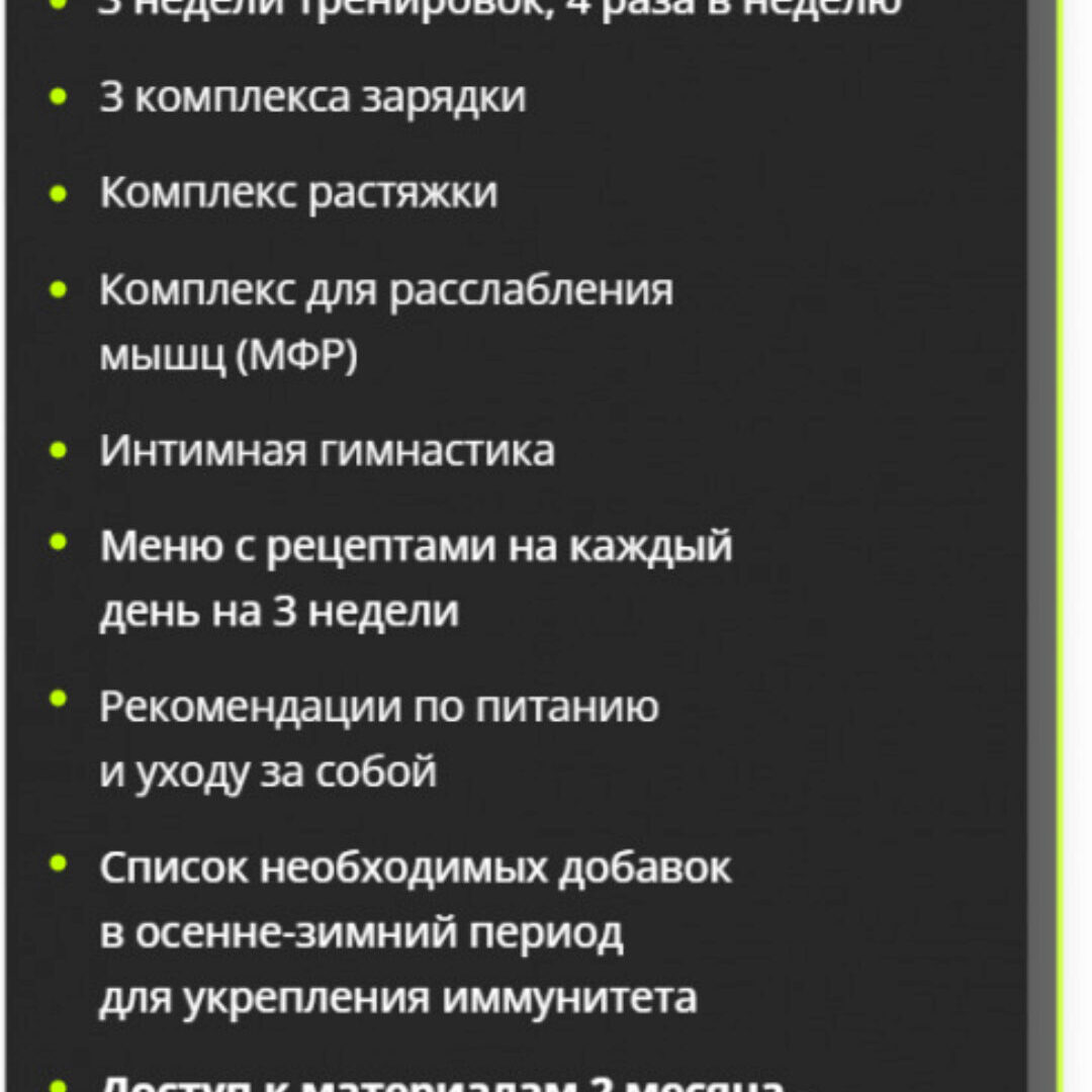 РЕЗУЛЬТАТ КУРСА: Преобразитесь так, что заметят все! Перестанете сидеть на диетах и сможете есть и худеть Появится уверенность в себе Качество тела заметно улучшится Появится энергия и интерес к жизни Ягодицы будут упругие, как орех Сбросите от 10 кг за 21 день Начнете любоваться собой в зеркале Я