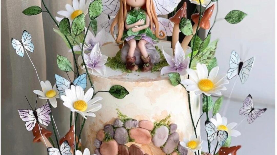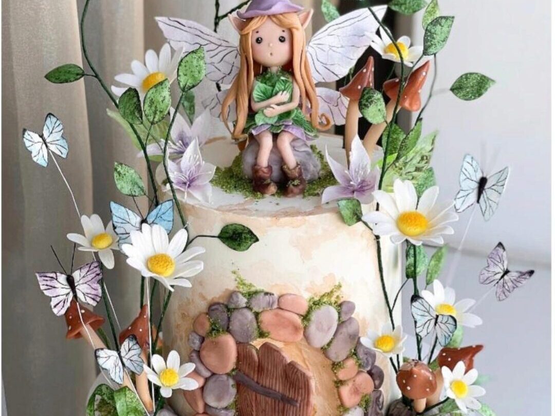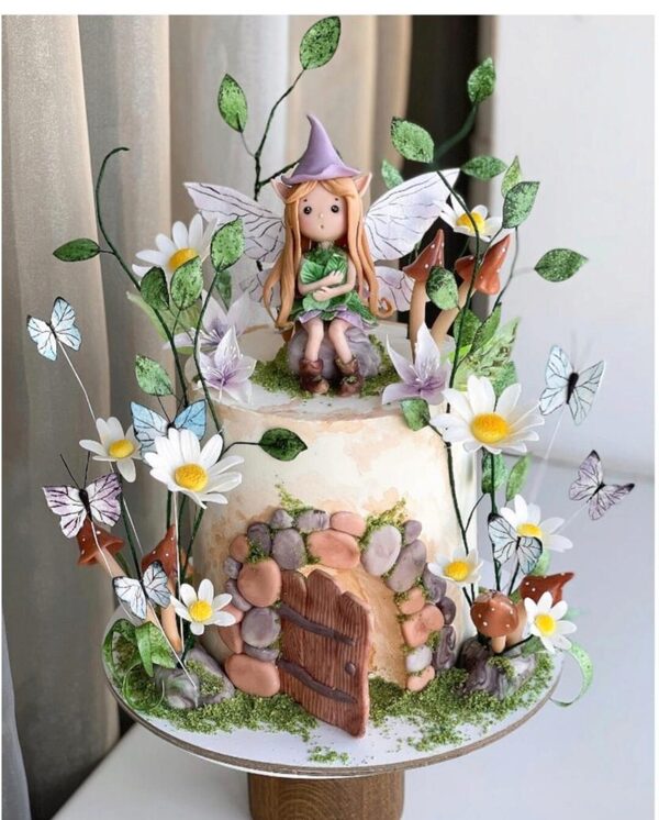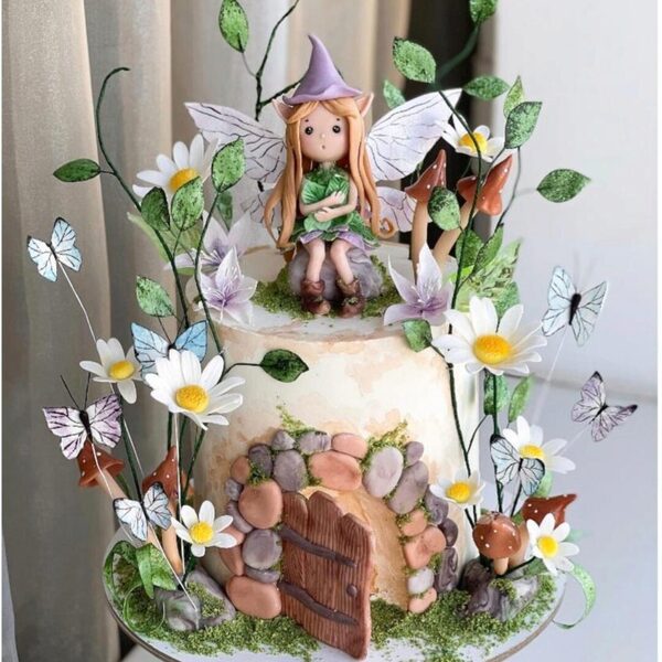 Декор из мастики: ромашки, грибочки, камни, дверь. Лепка фигурки феи с крылышками из вафельной бумаги. Создание веточек, листьев, цветов, бабочек из вафельной бумаги и их окрашивание. Работа с изомальтом, создание листьев. Изготовление зеленого мха. Окрашивание покрытия красителями. Оформление торта