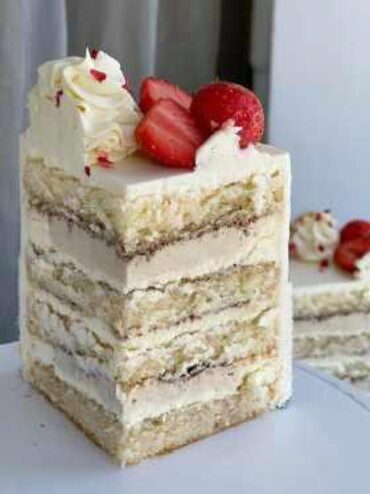 Рецепт и техника бисквитного торта Красный бархат Внутри красного бархата клубничный ганаш, конфитюр и сырный крем.