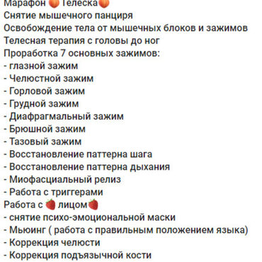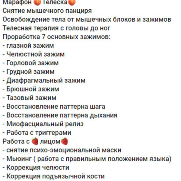 2 марафона: Марафон здоровья - 3 дня, Марафон по сидячему образу жизни - 3 дня. 2 вебинара: Вебинар «Как избавиться от боли в спине за 3 шага», Вебинар по осенней хандре. Подробнее про каждый Марафон здоровья - кому нужно: 1. Хотите избавиться от боли в пояснице, шее и других частях тела 2. Хочется