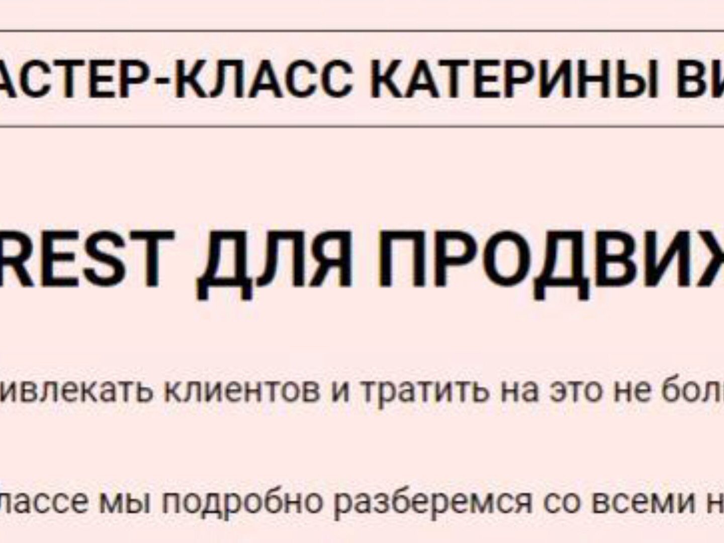 1)Поток новых клиентов Создайте бесконечный поток новых клиентов не только из Pinterest, но и из Google, а я вам в этом помогу. 2)Яркий и незабываемый личный бренд Покажите себя потенциальным клиентам с самой выгодной стороны, влюбите их в себя. После прохождения тренинга эту задачу вы будете
