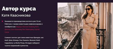 1. Знакомство с приложениями 2. Основы монтажа reels 3. Съемка и монтаж в стиле Reels 4. Съемка и монтаж в стиле reels продвинутый монтаж 5. Создание портфолио -Алина Акилова (3,9м подписчиков) - Алла Бурлетова (2м подписчиков) - Лилиана основатель VIDEOWAY - Элли профессиональная модель + 2 партии