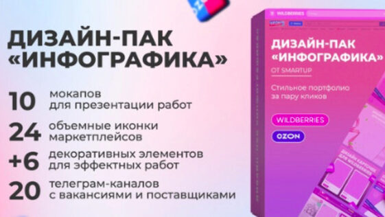 Если вы специализируетесь на карточках товаров для маркетплейсов, то дизайн-пак поможет вам выразительно презентовать свои работы заказчикам, элегантно украсить мокапы лентами, значками, объёмными элементами. Теперь показ карточек не будет проблемой, а ваше время будет тратиться исключительно на работу, а не головоломки с оформлением кейсов для портфолио)
