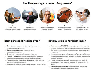 Голос на миллион ! Красивый и сильный голос за 14 дней!ВСЁ, ЧТО ВАМ НУЖНО – ЭТО ПРОСТО ВКЛЮЧАТЬ ВИДЕО И ВЫПОЛНЯТЬ УПРАЖНЕНИЯ ВМЕСТЕ СО МНОЙ! Более того, Вы получите аудио-версию каждого урока - для прослушивания и занятий в машине во время пробок! Каждый урок длится примерно 20-30 минут. График