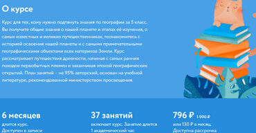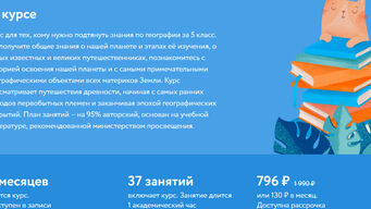 О курсе Курс сделает изучение географии еще более увлекательным и захватывающим. Мы побываем на всех шести материках, посмотрим на самые удивительные объекты природного и культурного наследия, расположенные на планете Земля. Время еще раз убедиться, что география – это интересно! 10 занятий