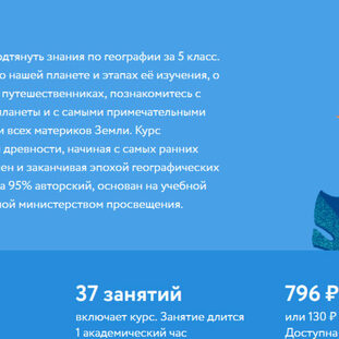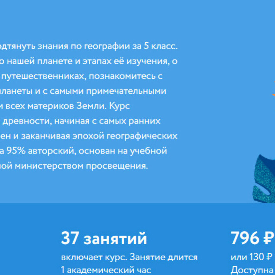 Вы получите: материалы курса в записи. О курсе: Курс для тех, кому нужно подтянуть знания по географии за 5 класс. Вы получите общие знания о нашей планете и этапах её изучения, о самых известных и великих путешественниках, познакомитесь с историей освоения нашей планеты и с самыми примечательными