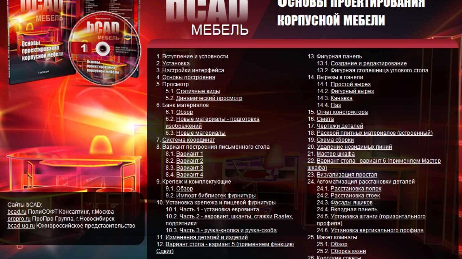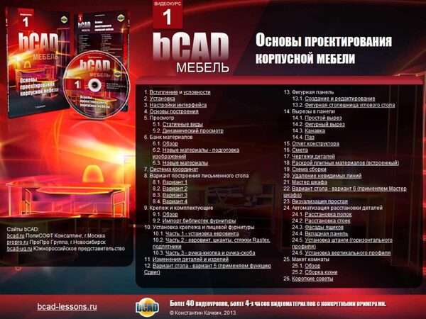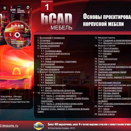 Более 40 видеоуроков, продолжительностью 4,5 часов. «Воды» в курсе нет, все только самое нужное для понимания принципов проектирования в bCAD Мебель. В курсе нет «голой» теории, все разбирается на конкретных примерах. Курс написан мебельщиком-практиком, поэтому в курсе - только нужное для мебельщика.