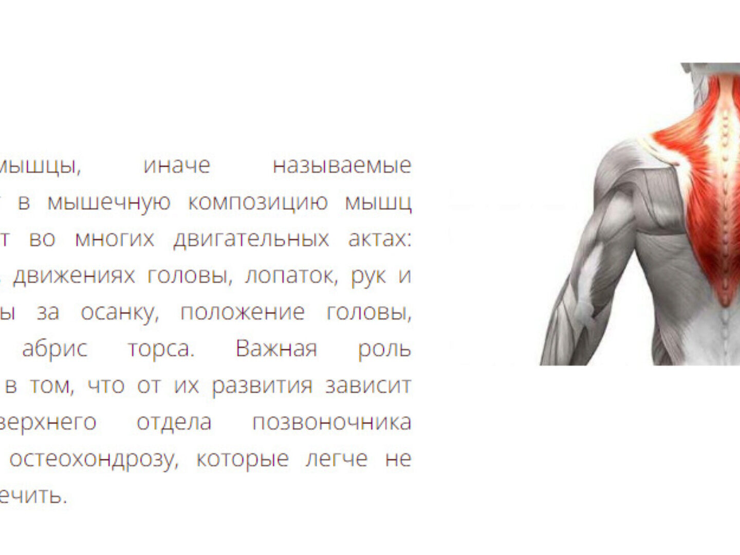 Трапециевидные мышцы, иначе называемые капюшонными, входят в мышечную композицию мышц туловища и участвуют во многих двигательных актах: изгибах позвоночника, движениях головы, лопаток, рук и т.д. Они ответственны за осанку, положение головы, формируют общий абрис торса. Важная роль трапецевидных мышц в том, что от их развития зависит состояние всего верхнего отдела позвоночника подверженного часто остеохондрозу, которые легче не допустить, чем потом лечить.