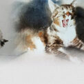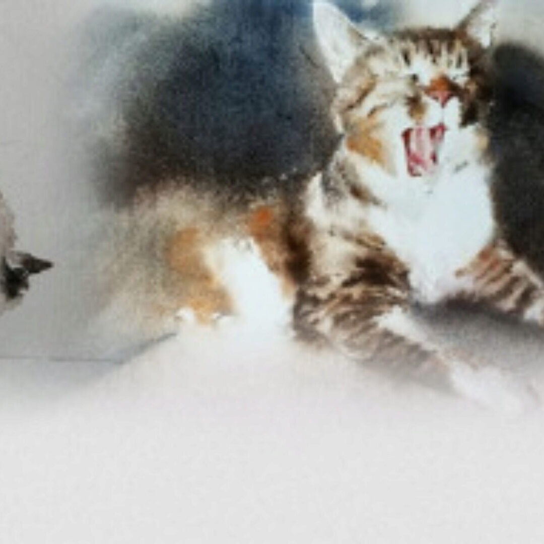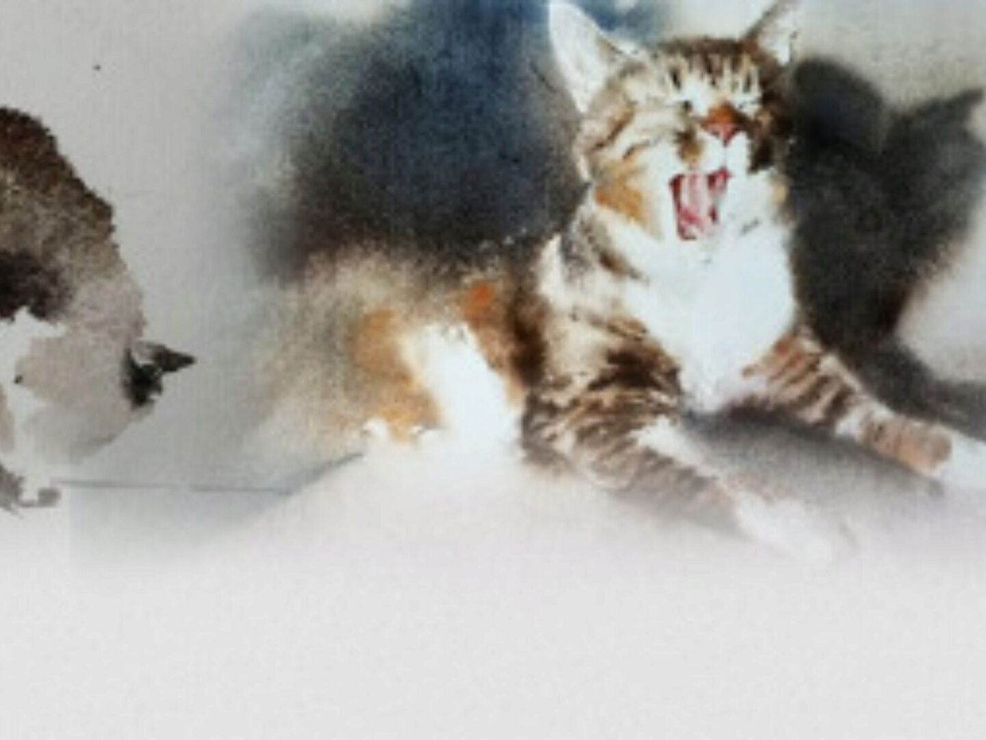 Две работы - два разных подхода А ля Прима. Эффект мягкой шерсти и воздушная дымка по мокрому. А после - точность и конкретность образов в работе по сухой бумаге. Возьмем два метода: по мокрому и по сухому — напишем 2-х котов. Отработаем все акварельные приемы: от контролируемого растекания до