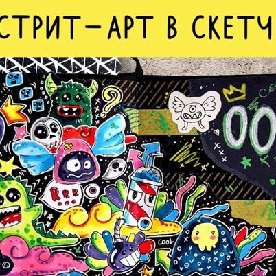 - создадим яркие иллюстрации и надписи в стиле граффити в скетчбуке;