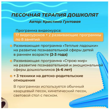 Видеокурс представлен в формате записи вебинара, который длится 3 часа 30 минут Пройдя видеокурс «Песочная терапия», Вы получите 7 уникальных авторских практик, которые помогут Вам: четко выстроить процесс понимания организации консультации в методе песочной терапии (техника «Свободное место»,