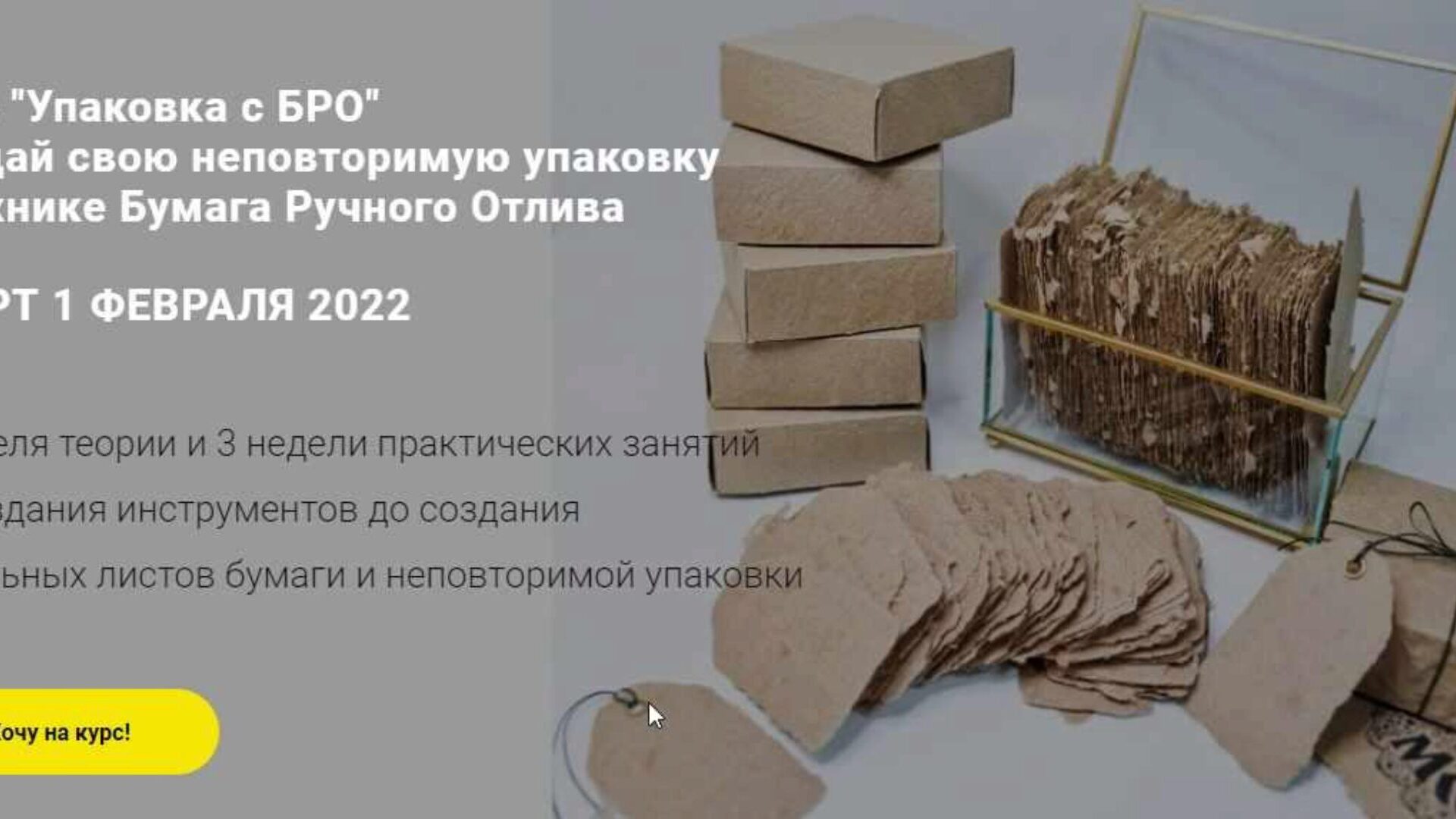 - За две недели практики научитесь отливать бумагу ручной работы, работать с сухоцветами, сделаете коробочки, бирки, визитки и открытки для своих изделий. И обязательно сделаете бумагу для каллиграфии и графики