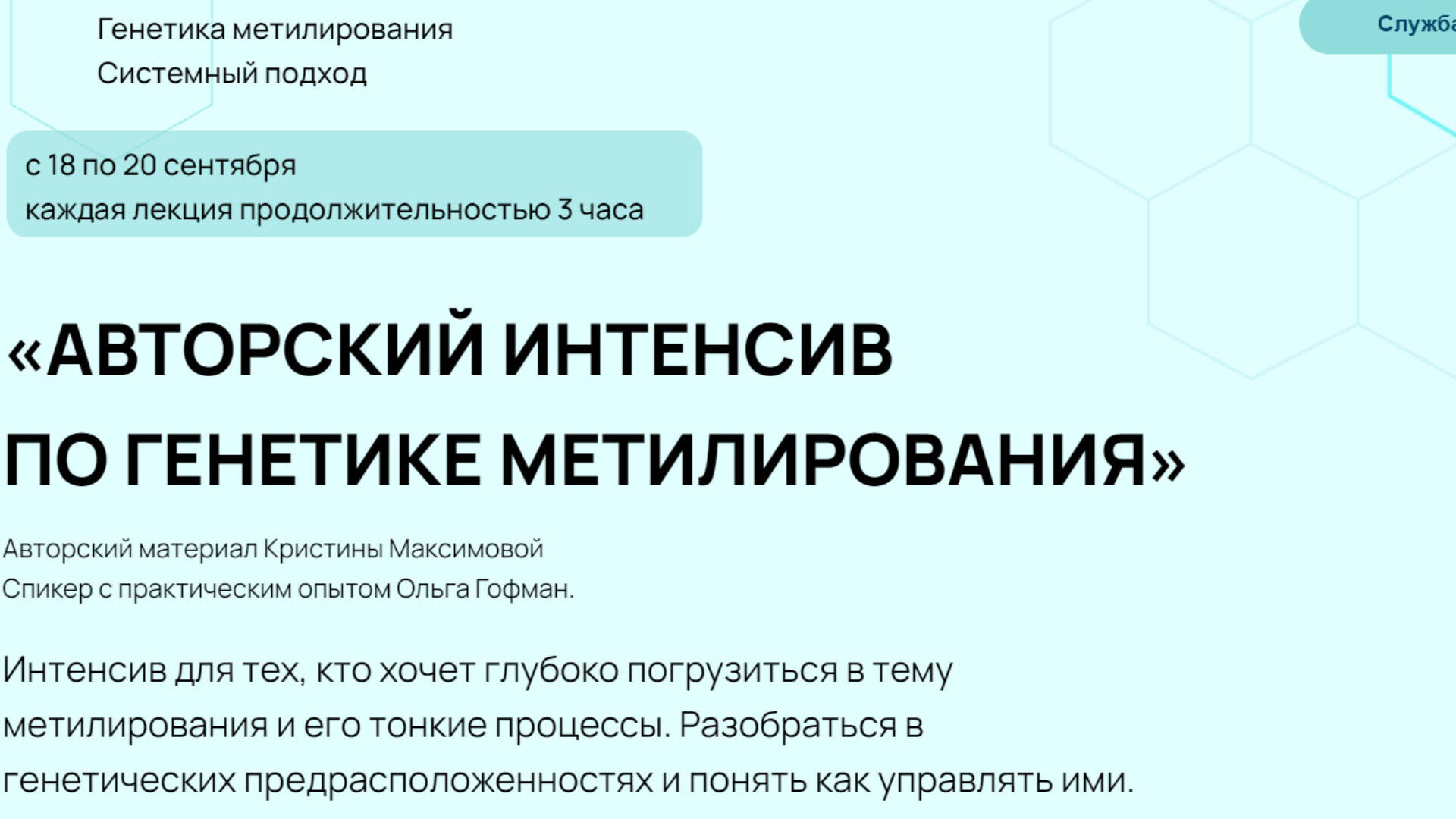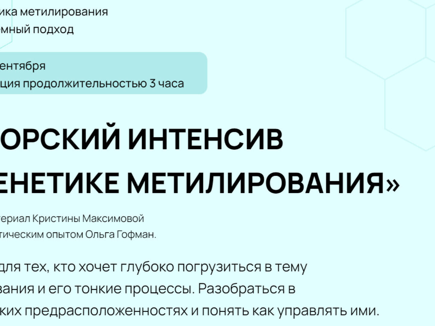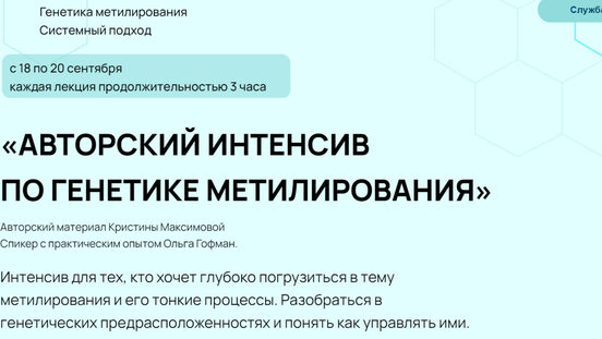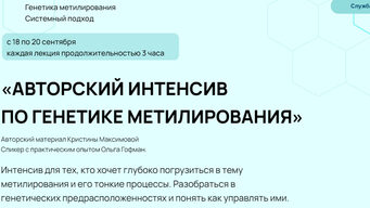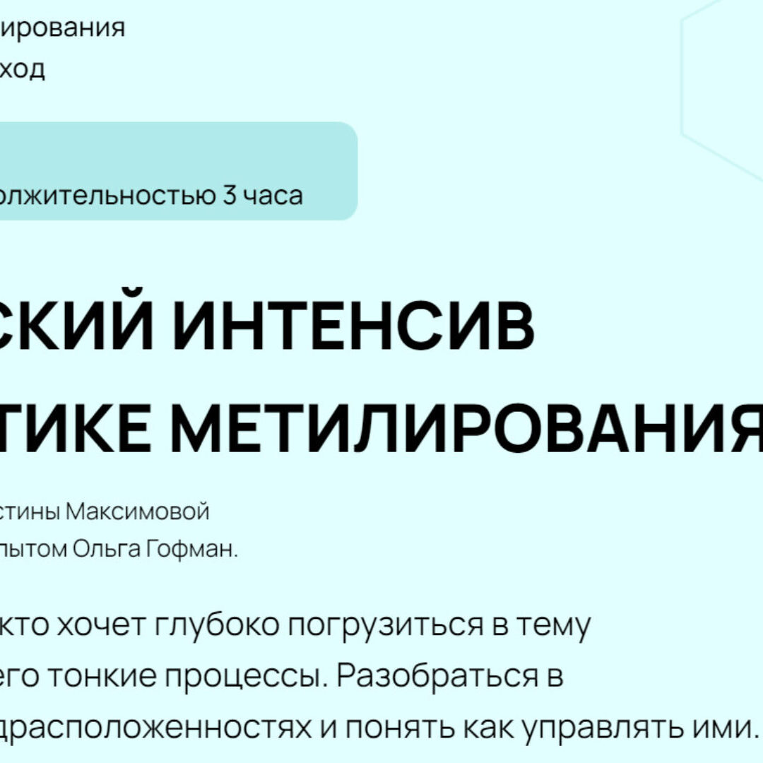 Генетика метилирования. Системный подход. с 18 по 20 сентября каждая лекция продолжительностью 3 часа Авторский материал Кристины Максимовой Cпикер с практическим опытом Ольга Гофман. Интенсив для тех, кто хочет глубоко погрузиться в тему метилирования и его тонкие процессы. Разобраться в