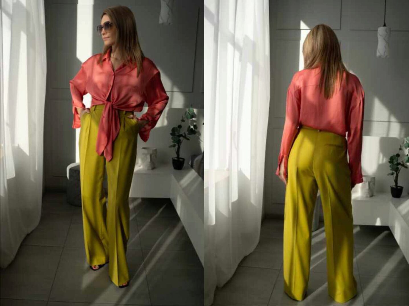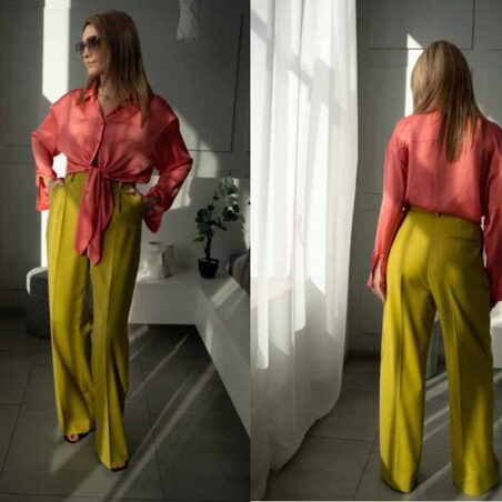 Брюки прямого силуэта, чуть расклешенные к низу. Наклонные карманы в боковых швах. На передних половинках брюк заутюжены складки и зафиксированы декоративной строчкой. На задних половинках талевые вытачки. Пояс притачной с эластичной резинкой. Длина брюк в пол. Линия талии на естественном месте.
