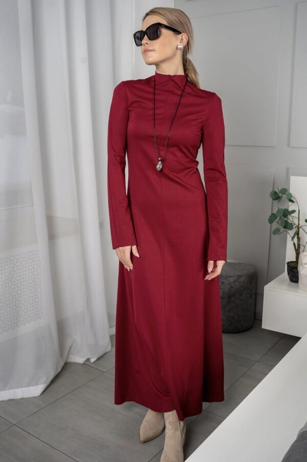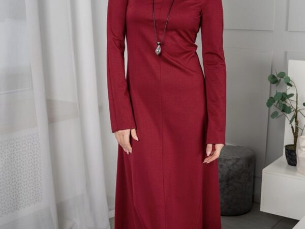 книзу. Горловина платья оформлена цельнокроеным воротником-стойкой. Рукав втачной,