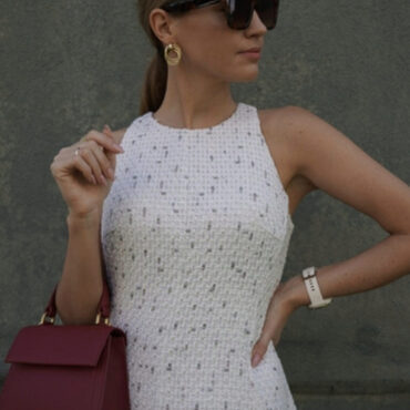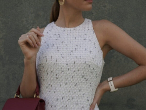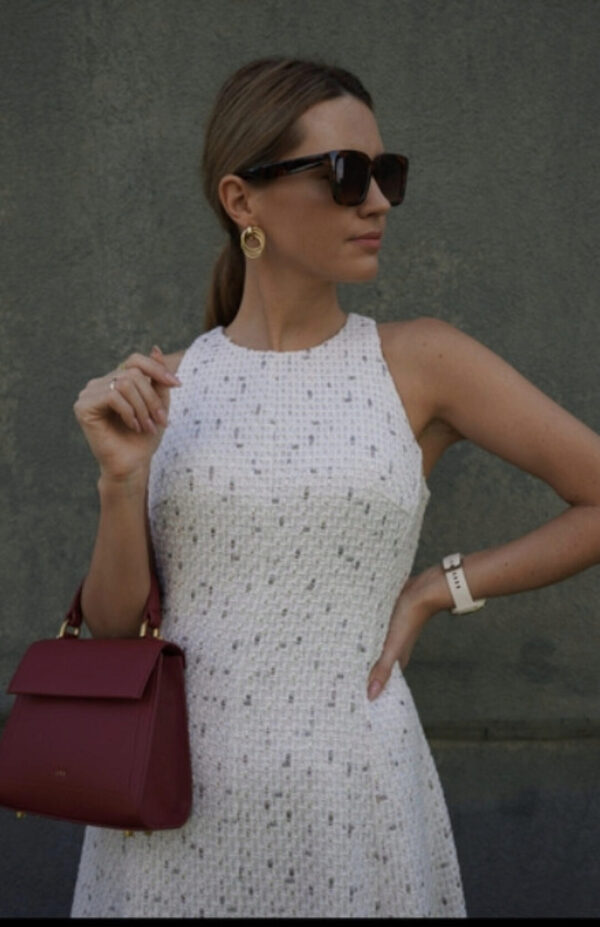 На фото платье выполнено из костюмной смесовой ткани (твид), по составу вискоза + хлопок + полиэстер + эластан, подкладка из вискозы.