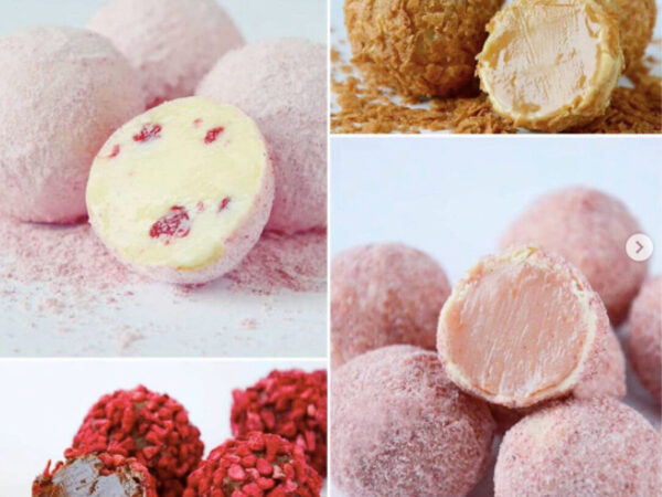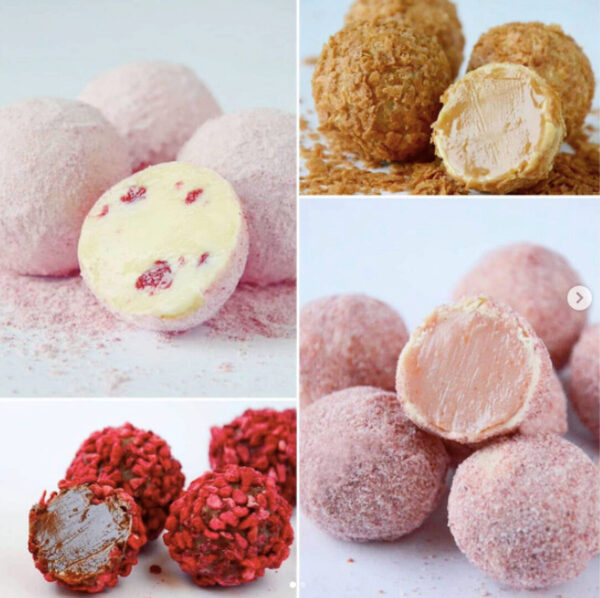 Трюфели 1.0 карамель с солью клубника с шампанским кофе с айриш крим черная смородина с ликером зелёный чай, имбирь, лимон мята и лайм фундук маракуйя и карамель кокос с лаймом апельсин с чаем эрл грей Трюфели 2.0: клюква, апельсин и корица земляника с грейпфрутом рождественское печенье дыня с