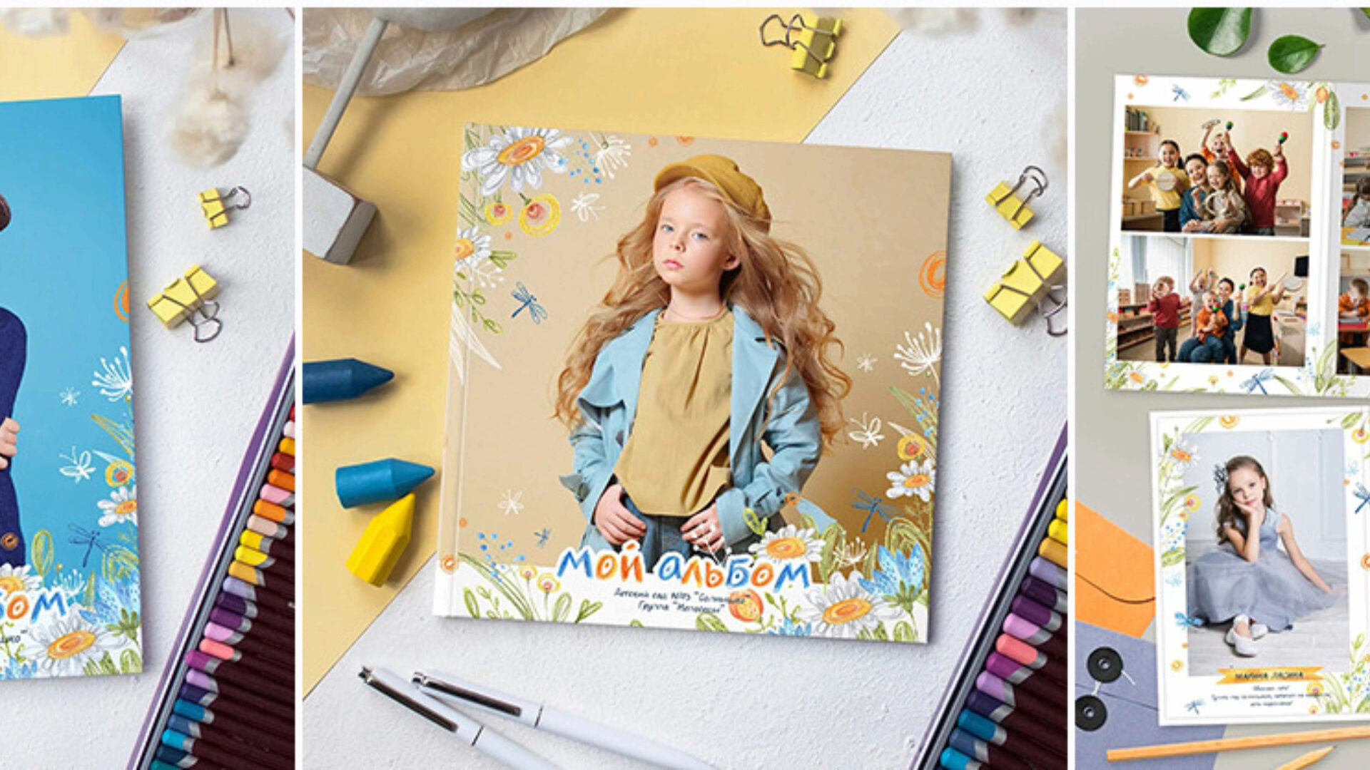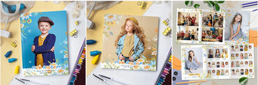 Универсальный дизайн для первого класса, детского сада, начальной школы В шаблон входят: в шаблон входит Psd-файл с надписями для детского сада и начальной школы 2 варианта обложки — общая и с портретом 5 разворотов, включая виньетку и индивидуальный на первом развороте мальчика/девочку