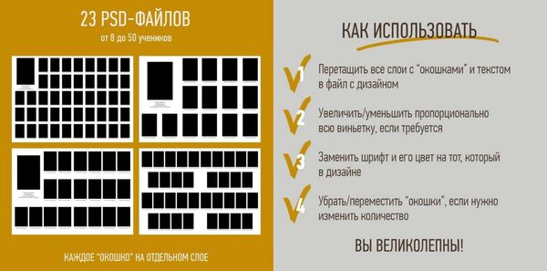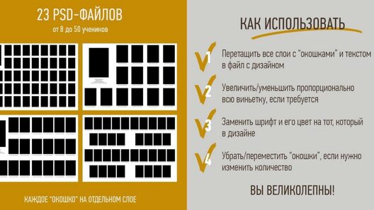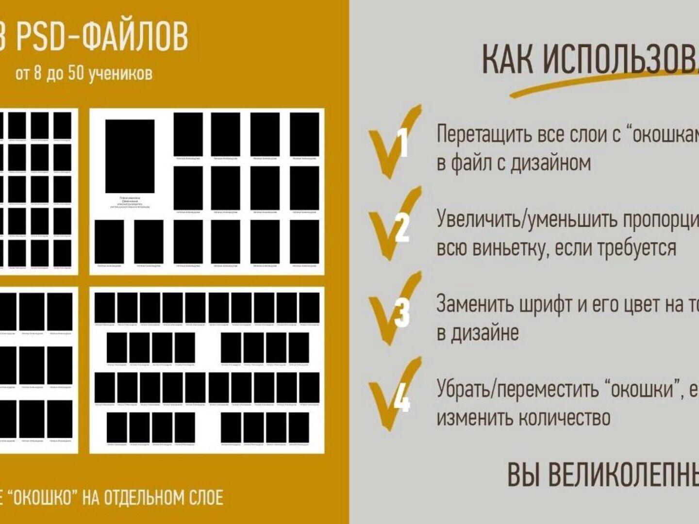 Информация о товаре Шаблон фотокниги «Умники и умницы» Формат PSD. 4 варианта обложки + 12 разворотов Все шрифты включены Шаблон редактируется в программе Photoshop В комплекте идет видео инструкция по применению Размеры фотокниги: 21*30 см Точный размер обложки: 49,3*33,3 см Точный размер
