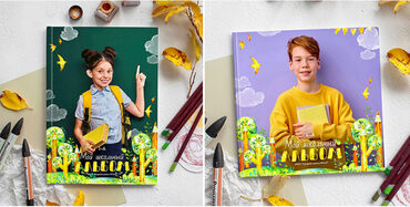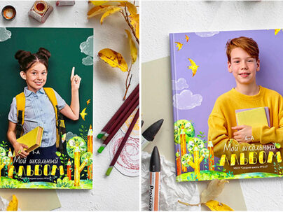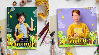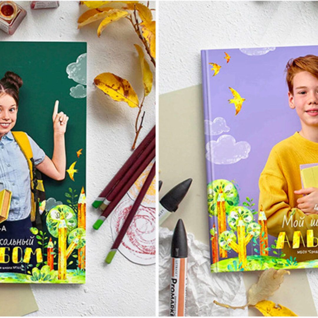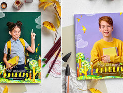 Универсальный шаблон для младших классов и детского сада Будет шикарен для фото на любом фото — однотонном темном, светлом, ярком. На фоне класса, для уличной съемки и фото в библиотеке. индивидуальная и общая обложка у каждого формата шаблона «МОЙ КЛАСС» на обложке меняется на «ВЫПУСКНОЙ АЛЬБОМ» и
