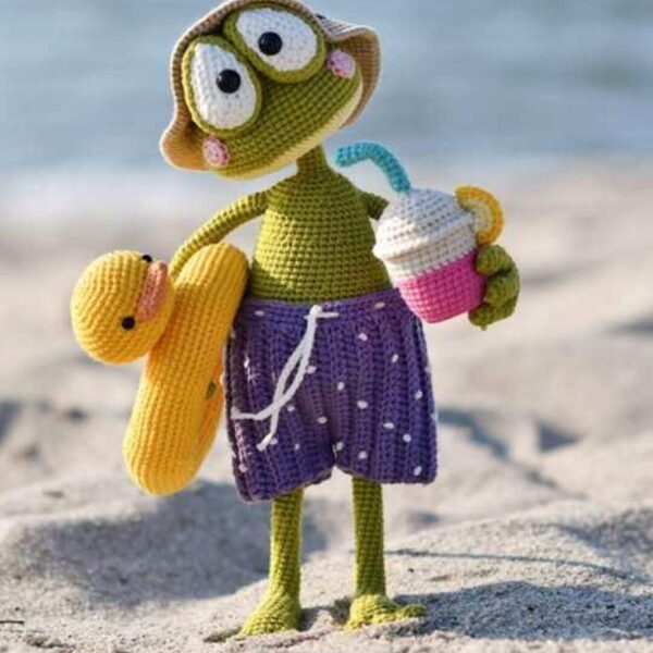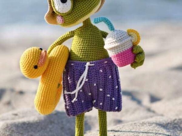 Файл содержит пошаговое текстовое описание с фотографиями алгоритма создания игрушки - лягушки, шляпки, купальных трусиков, надувного круга и лимонада.