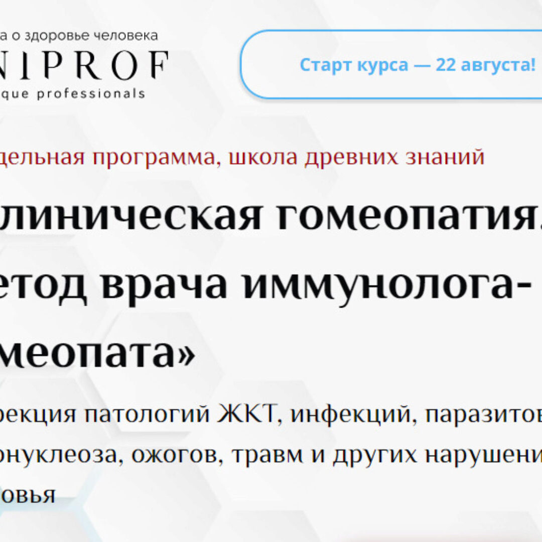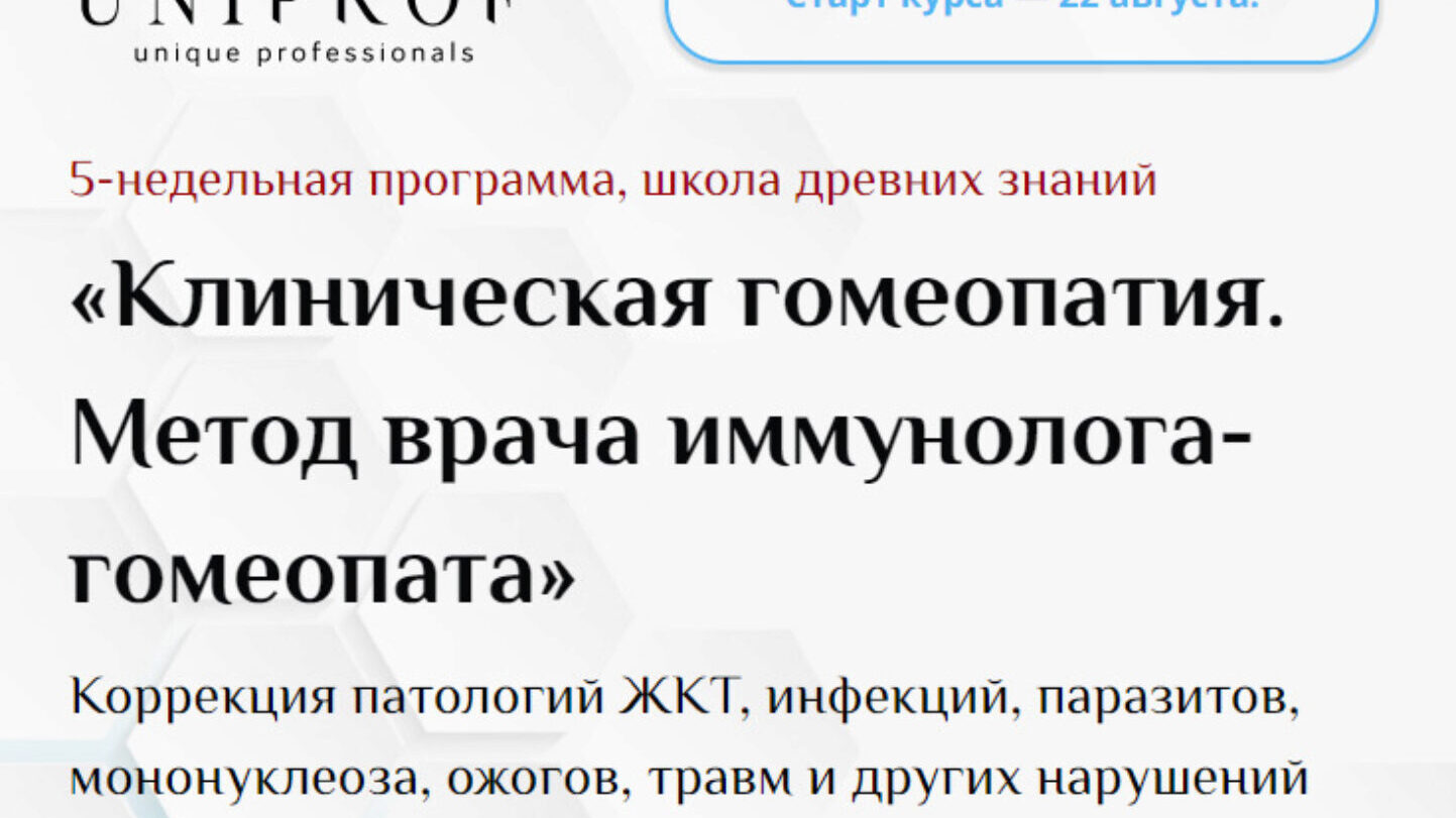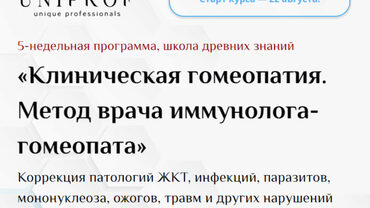 5 курсов: Курс «Клиническая гомеопатия» (18 ч) Врач-гомеопат, аллерголог-иммунолог, кандидат медицинских наук Ксения Успенская Коррекция патологии ЖКТ, инфекций, паразитов, мононуклеоза, ожогов, травм и других нарушений здоровья Вы сможете подбирать гомеопатические препараты Разберетесь при каких