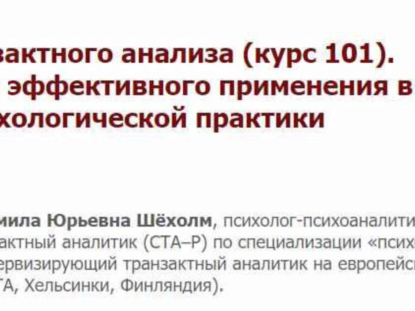 О вводном курсе Транзактного Анализа (ТА-101) О ТРАНЗАКТНОМ АНАЛИЗЕ Транзакционный анализ (TA) — это модель, которая помогает понять поведение, отношения и коммуникацию между людьми. Он был первоначально разработан в 1950-х годах Эриком Берном. Вводный курс посвящен теории транзактного анализа, в