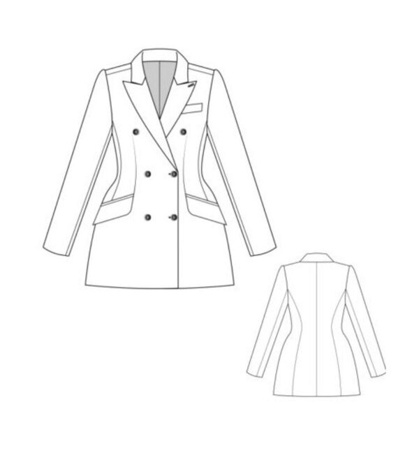 Жакет прилегающего силуэта малого объема в верхней части на уровне линии груди и талии и среднего объема в нижней части на уровне линии бедер, на притачной подкладке. Спинка и полочка с отрезными бочками. Прилегание по спинке достигается за счет плечевых, талиевых вытачек и среднего шва спинки.
